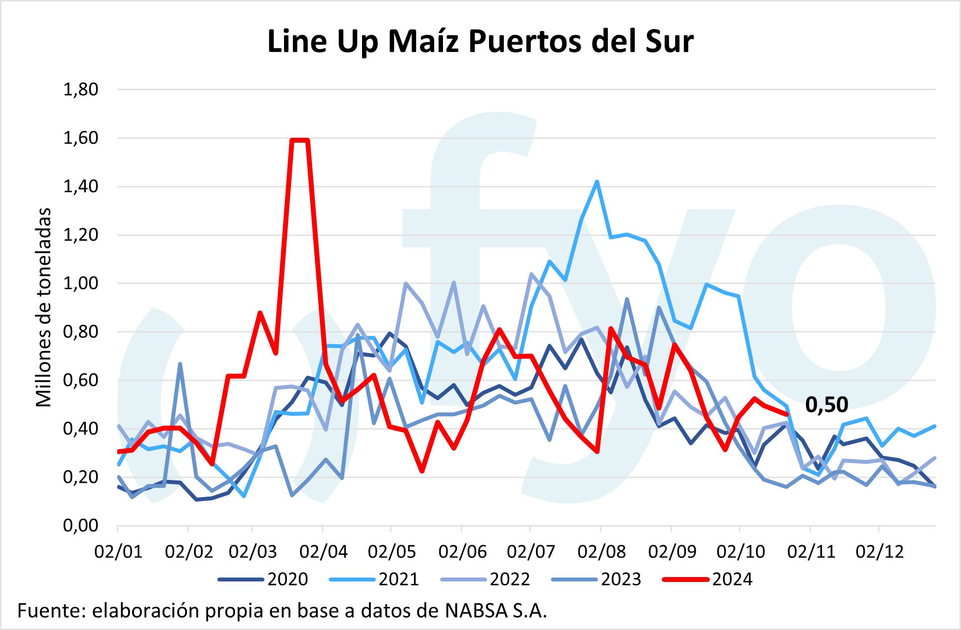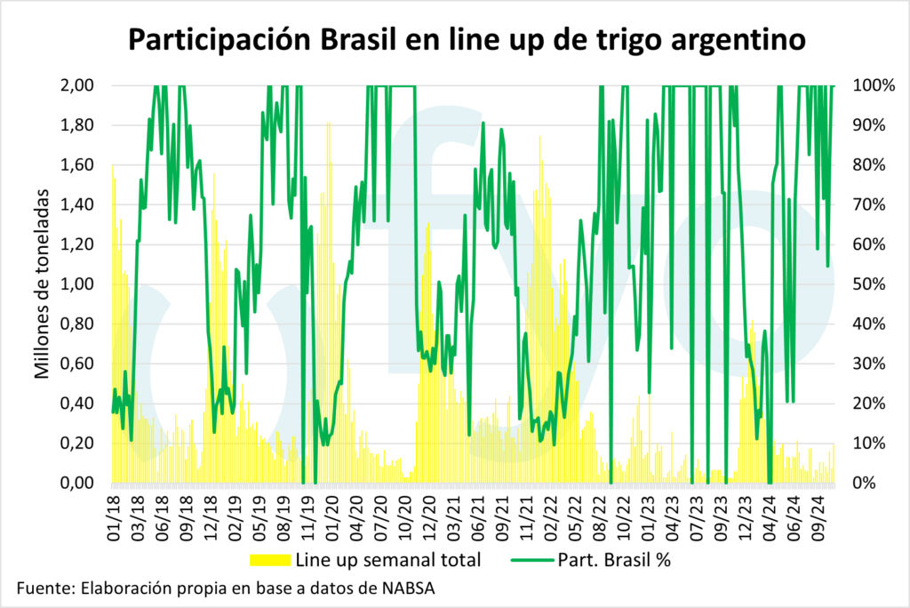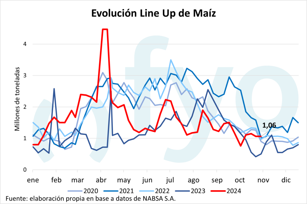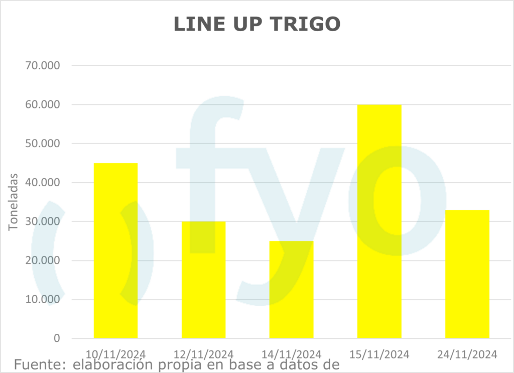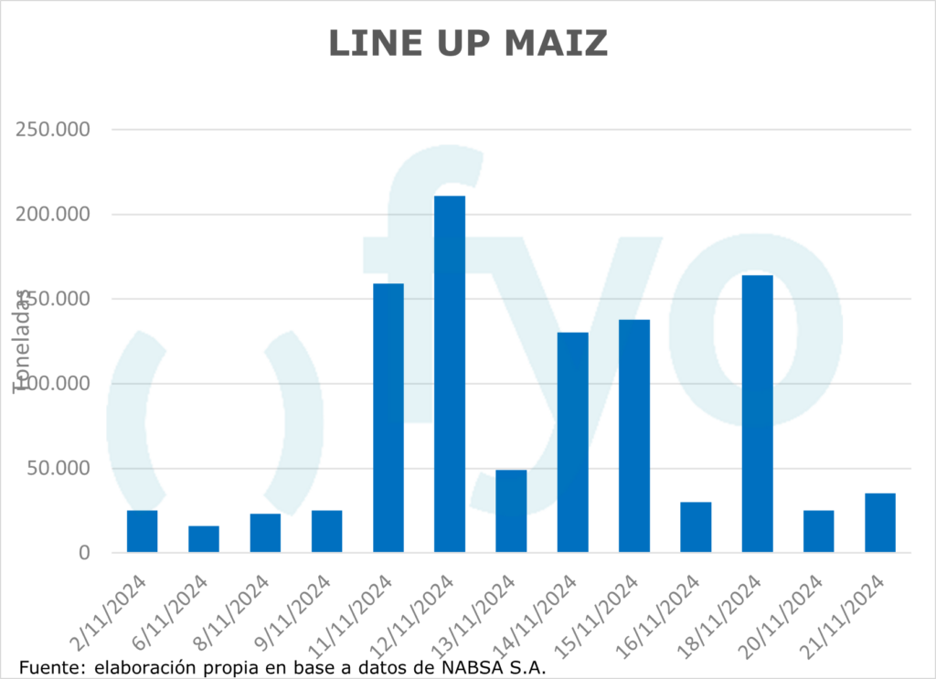 La agencia Nabsa publicó su informe con los compromisos de embarque en el territorio argentino hasta el 11 de noviembre. El line up de maíz se sostiene en el millón de toneladas, con compromisos en el sur por 460.000 toneladas. Por el lado de la soja, el line up de poroto crece 40.000 t hasta las 70.000 toneladas; mientras que el programa de aceite disminuyó 40.000 toneladas, aunque permanece inusualmente alto a esta altura del año en 420.000 toneladas. Por el lado del trigo, el programa de embarques comienza a mostrar el ingreso de la nueva cosecha, creciendo de 75.000 a 193.000 toneladas, de las cuales 148.000 pertenecen a Up River.