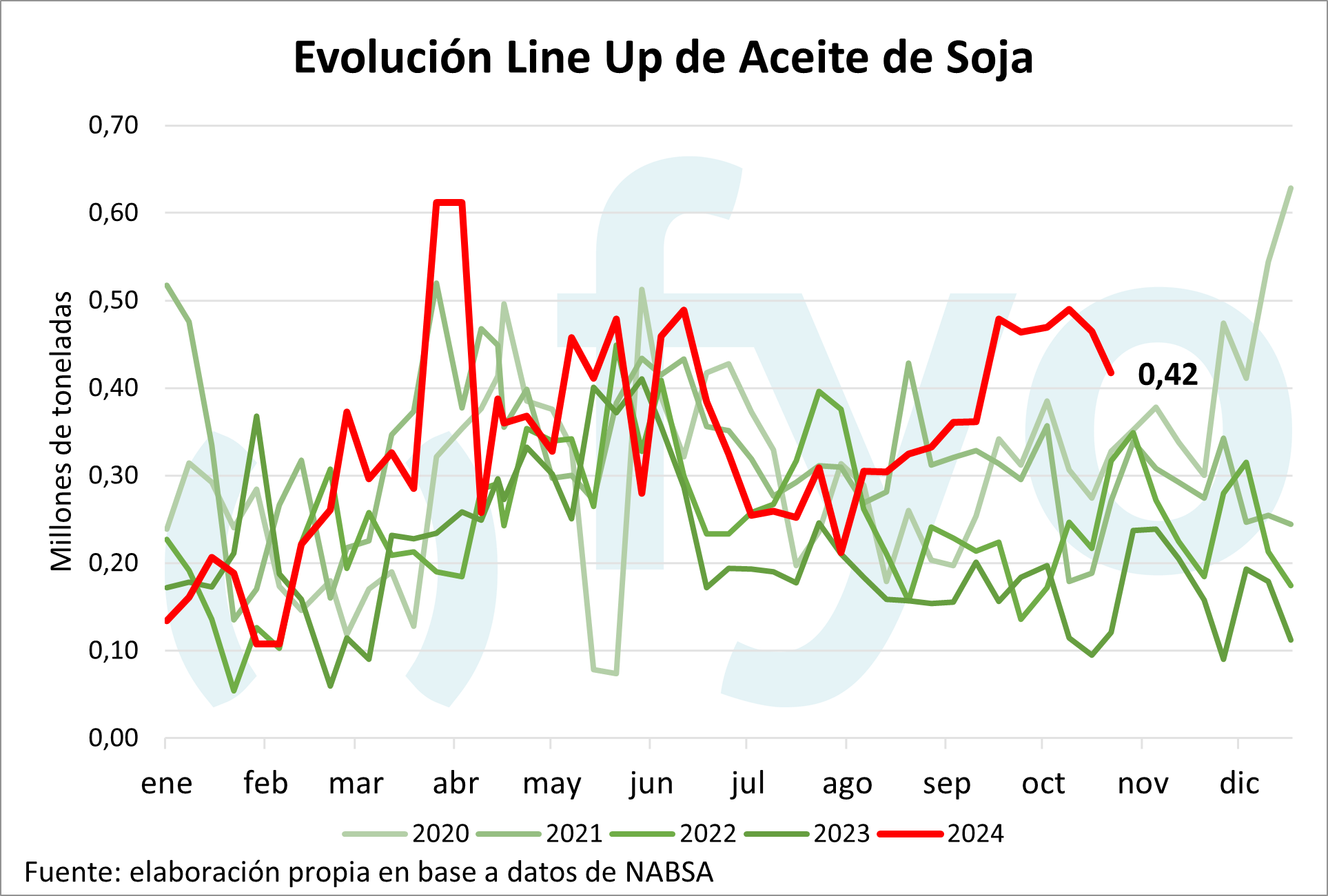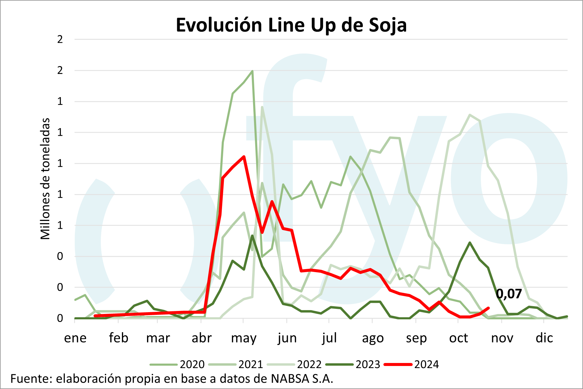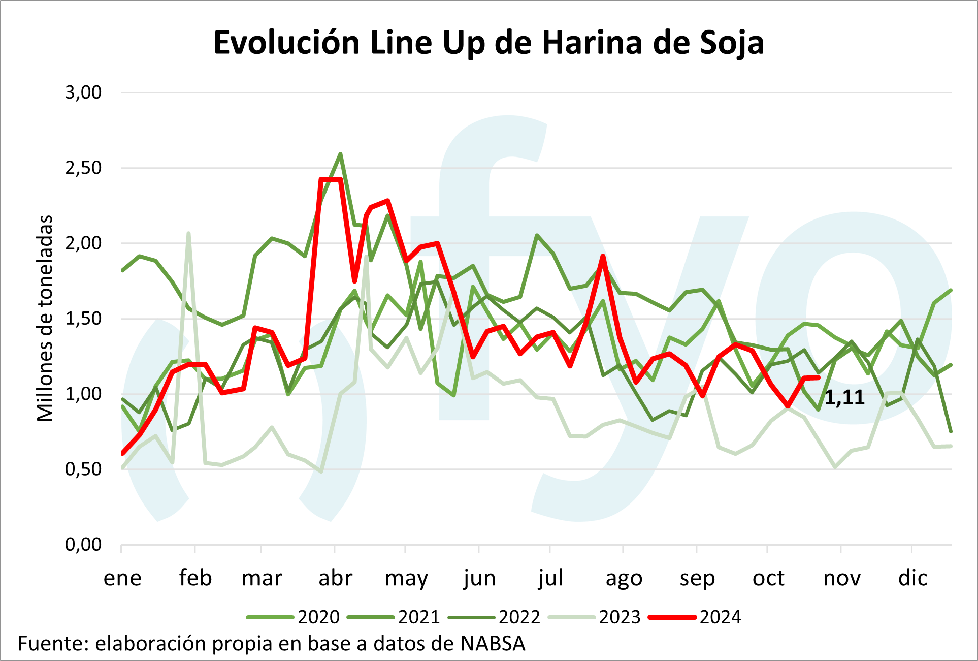 La agencia Nabsa publicó su informe con los compromisos de embarque en el territorio argentino hasta el 11 de noviembre. El line up de maíz se sostiene en el millón de toneladas, con compromisos en el sur por 460.000 toneladas. Por el lado de la soja, el line up de poroto crece 40.000 t hasta las 70.000 toneladas; mientras que el programa de aceite disminuyó 40.000 toneladas, aunque permanece inusualmente alto a esta altura del año en 420.000 toneladas. Por el lado del trigo, el programa de embarques comienza a mostrar el ingreso de la nueva cosecha, creciendo de 75.000 a 193.000 toneladas, de las cuales 148.000 pertenecen a Up River.