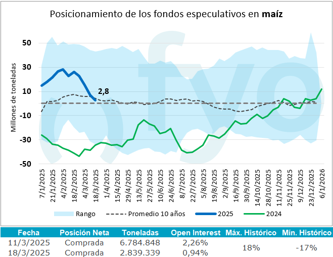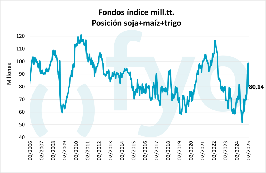 En el caso de la soja, tuvimos poca variación neta entre semanas. En cuanto al maíz, el comportamiento sigue mostrando ventas netas por cuarta semana consecutiva (acumulando 24 Mt); de todas formas, la posición neta continúa siendo compradora, por el equivalente a 2,8 millones de toneladas. Para el trigo, tampoco hubo variación significativa.
