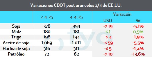 Recién el viernes China publicó una medida específica: sumar un 34% a las importaciones desde los Estados Unidos que ya estaban gravadas con aranceles desde marzo (soja y sorgo quedarían con un 44%, maíz y trigo con un 49%). La medida entrará en vigor el 10/04.