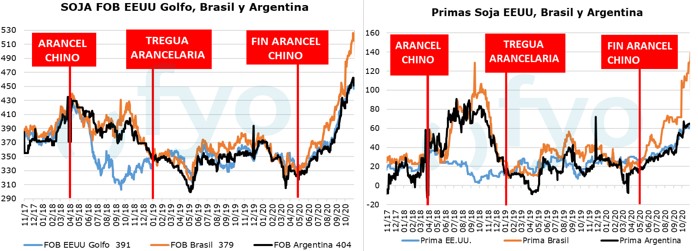 Cuando China anunció los aranceles, los precios en Estados Unidos cayeron, pero en Sudamérica se mantuvieron gracias a la ayuda de las primas, normalizandose la situación cuando se acordó la salida de la guerra comercial.