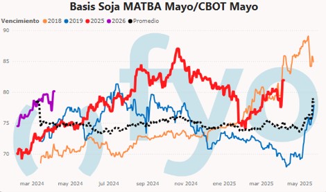Si vemos los precios del mercado a término en el mercado local, la soja en Matba cayó menor proporción que la caída en Chicago. La posición mayo afuera cayó USD 12,40 (-3,4%), mientras que en el mercado a término local cayó USD 1,70 (-0,6%). El basis, que ya estaba alto, se alejó aún más de los promedios. La relación pasó al 82%, cuando los promedios se encuentran en torno al 75%.