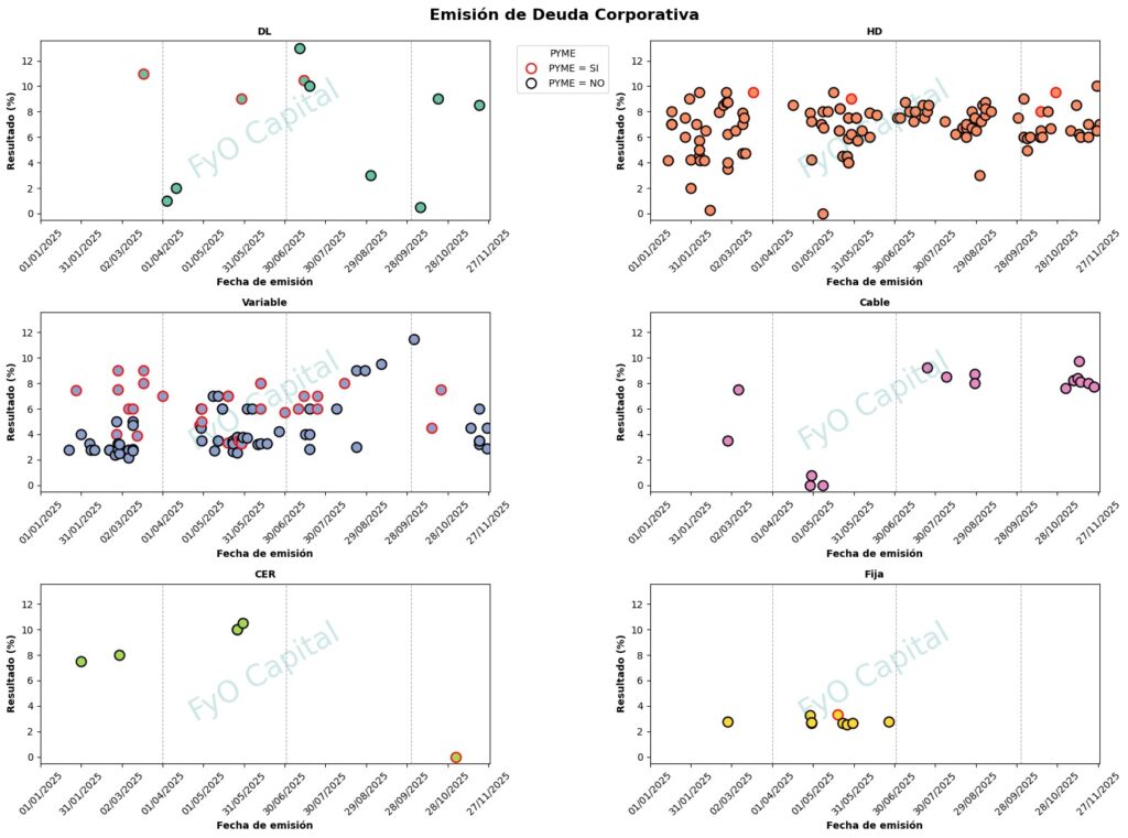 Ajuste por inflación (UVA-CER): 1 bono pyme que juntó 6.152.256 UVA ($10.047 millones) con una duration de 6,16 años.