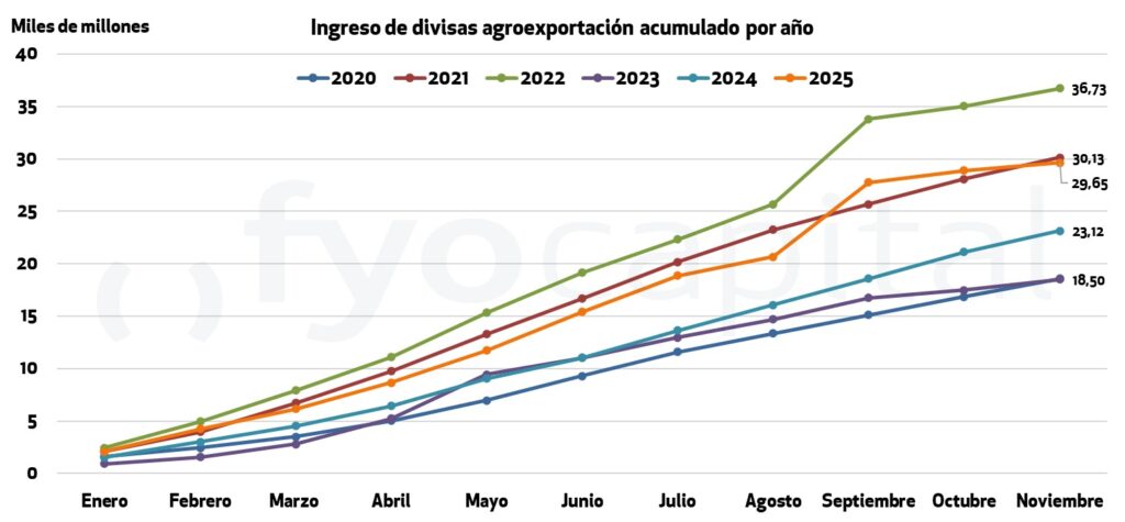 Además, la oferta de dólares agro de este año sigue siendo excelente en términos objetivos considerando que los precios no han sido los mejores en el mercado internacional. El acumulado anual, en comparación contra 2024 tiene un incremento entre enero y noviembre de 24%: 23.124 millones versus 29.651 actuales. Ya nos encontramos arriba del total anual de 25.090 millones de 2024, y si se cumplen las estimaciones que prevén un volumen de liquidación de 1.500 para diciembre producto de la entrada de la campaña fina, es muy probable que se perforen los 31.000 millones de dólares este año. Alcanzar este nivel nos situaría 6.000 millones por encima del promedio de los últimos 10 años, pero todavía lejos del máximo histórico de 2022 donde se liquidaron 40.438 millones.