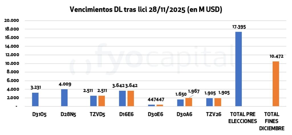 En la licitación del Tesoro nacional del miércoles 26/11 vencían 14,53 billones de pesos, y de ellos, un equivalente a 4.009 millones de dólares en bonos dollar linked (D28N5). Lo sorpresivo fue que hubo muy poco interés por continuar con este tipo de cobertura cambiaria, ya que las ofertas del público fueron por un equivalente a 400 millones de USD, pero se adjudicaron apenas 317 millones de “dólares-link” a la letra que vence el 30 de abril de 2026 y se declaró desierta la licitación de la letra con vencimiento el 30 de noviembre de 2026.