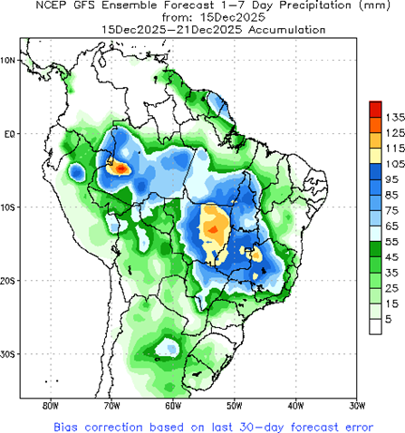 En Brasil, las condiciones hídricas se han normalizado tras dificultades en el inicio de campaña hacia el sur y centro-este. Los pronósticos de corto plazo (15-21 dic) indican acumulados favorables para el desarrollo de los cultivos en zonas importantes como Mato Grosso.