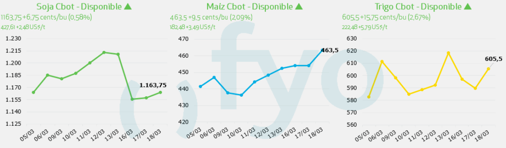 - El trigo registró ganancias en Chicago y Europa, impulsado por condiciones climáticas adversas en las zonas productoras de Estados Unidos y el riesgo de inflación global derivado de la guerra.