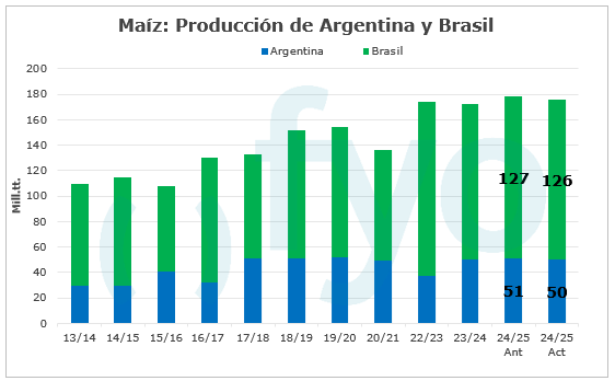 En Sudamérica, la producción de trigo en Argentina aumentó en 200.000 toneladas hasta las 17,7 Mt, mientras que en Brasil se redujo en 200.000 toneladas, llegando a 7,9 Mt. De esta forma, la relación stock/consumo global disminuye ligeramente en 0,3 puntos porcentuales, de 32,3% a 32%.