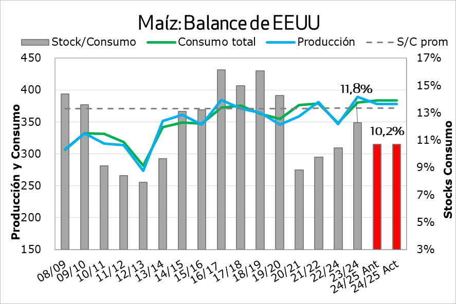 La hoja de balance para EE.UU. queda sin cambios al no informarse modificaciones en las estimaciones de produccion y consumo. De esta forma la relación stock/consumo se mantiene en 10,2%.