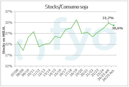 Con los ajustes productivos y una demanda en el mundo levemente en aumento, los stocks finales caen un 3%, y la relación stock consumo ajusta levemente desde 31,7% a 30,6%.