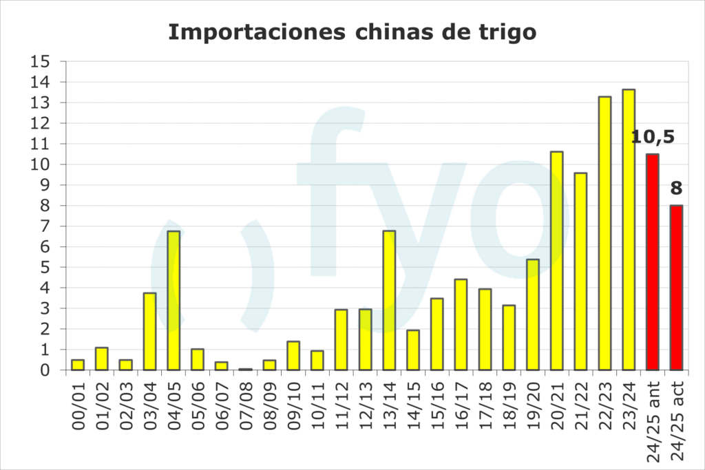 Respecto al trigo, la principal novedad proviene del lado de las importaciones chinas, con una disminución de 2,5 millones de toneladas, pasando de 10,5 a 8 Mt, lo que repercute directamente en los stocks finales, que pasaron de 133,1 a 130,6 Mt. Para Ucrania, se esperan 500.000 toneladas menos en exportaciones, alcanzando las 15,5 Mt, lo que incrementaría sus stocks finales.