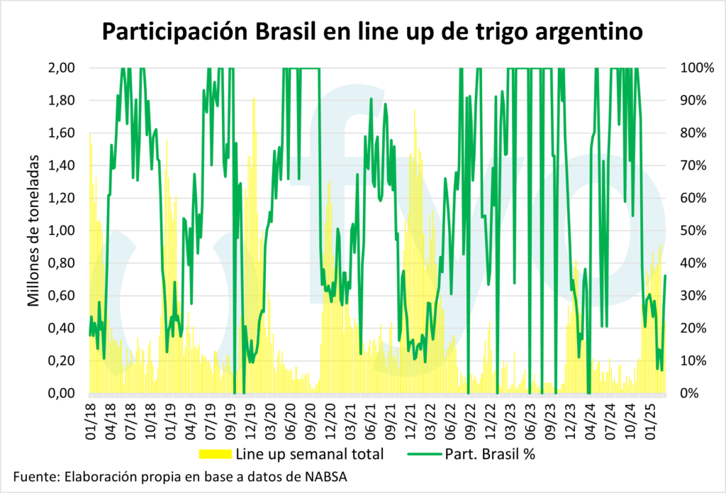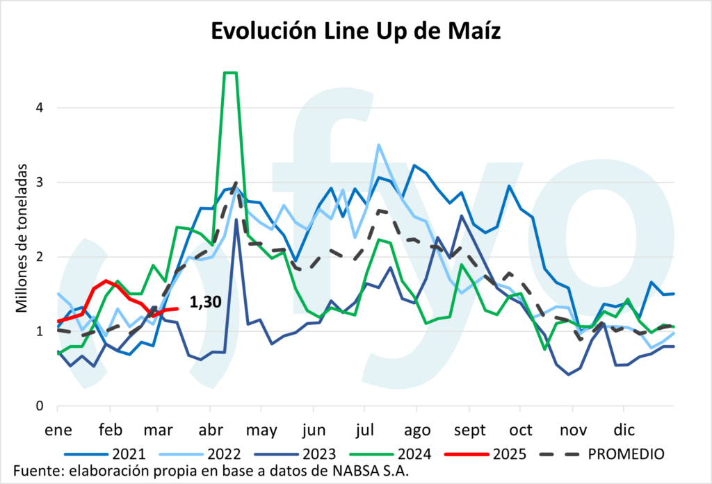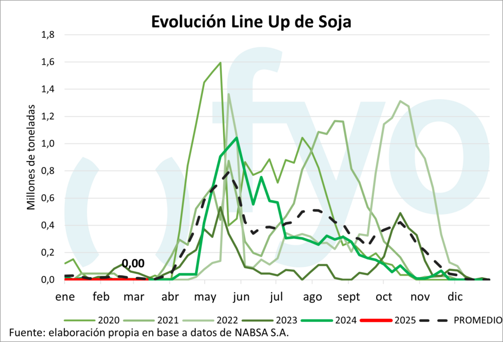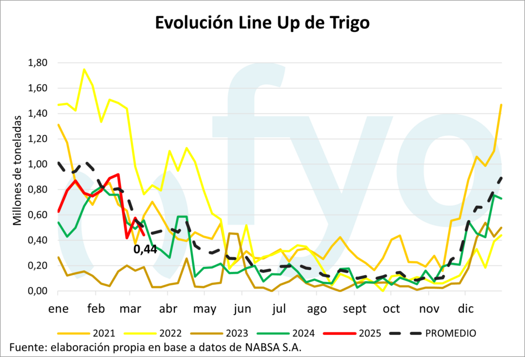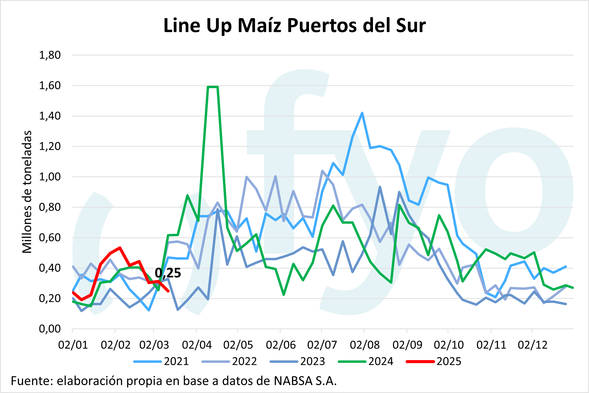 El line-up de maíz se mantuvo estable en 1,3 Mt. En cuanto a la soja, el poroto continúa sin contar con un programa de embarques, mientras que para el aceite de soja, con 400.000 t, se encuentra muy por encima de los promedios para la fecha. Por otro lado, en el caso del trigo, se observa una disminución de las toneladas comprometidas, arrojando un volumen programado de 440.000 t, inferior al promedio de 500.000 toneladas.