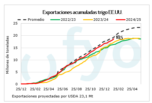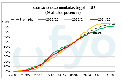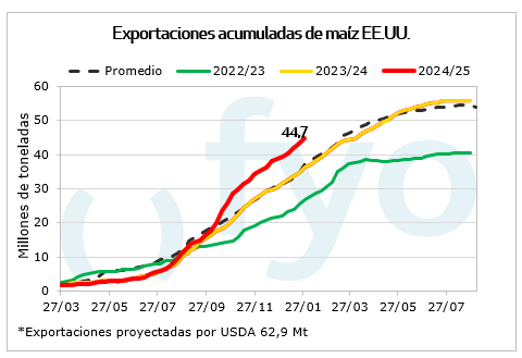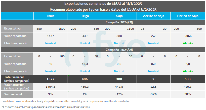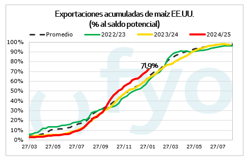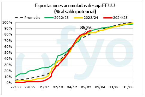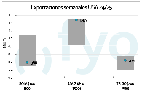 Las ventas de maíz alcanzaron las 1,4 Mt, en el rango superior de lo esperado por el mercado. Con México como principal destino, las ventas semanales superaron los datos de la semana precedente, aportando sostén a los precios del cereal. El acumulado de ventas para 2024/25 alcanza las 44,7 Mt, muy por encima del promedio de los últimos años para la semana de referencia. De esta forma, restan solo 18 Mt para alcanzar la proyección de exportación del USDA, cuando el año pasado a esta fecha faltaban 27 Mt. El mercado espera que el USDA eleve su proyección de exportaciones en su próximo informe mensual de Oferta y Demanda mundial.