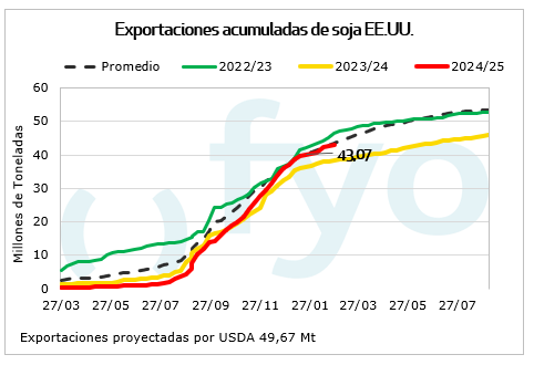 Por último, sorprendieron las ventas de harina de soja de 0,5 Mt, siendo el mayor volumen alcanzado desde el comienzo de la campaña 2024/25.