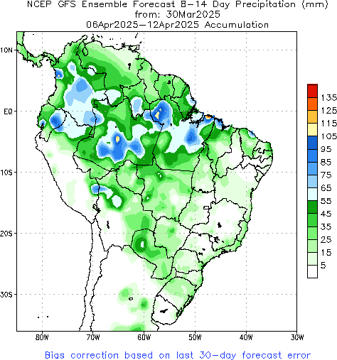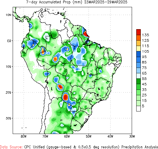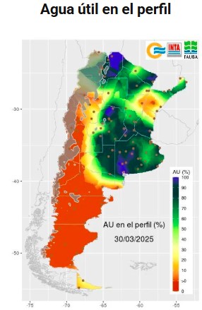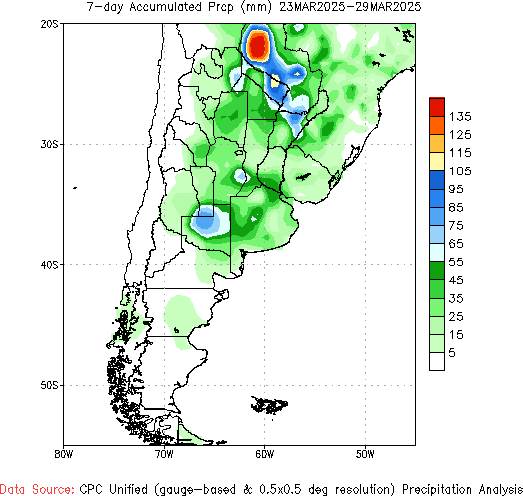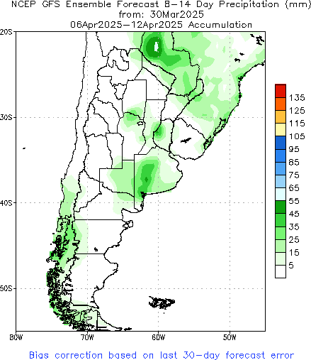 - Las próximas dos semanas se esperan lluvias por encima de lo normal sobre las zonas productoras de trigo norteamericano, lo que continuaría aportando al alivio hídrico del cultivo y sumando presión bajista sobre los precios.