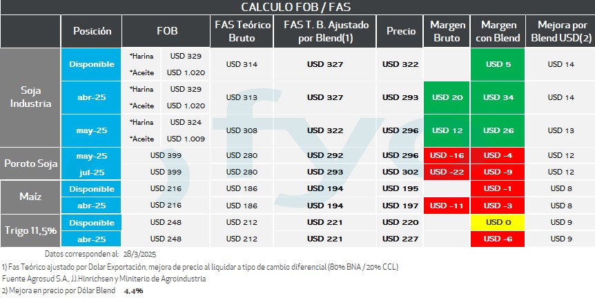 En el caso de la posición fábrica se parte de los precios FOB de los subproductos, luego se les aplica al valor del aceite, el porcentaje de rendimiento del poroto de soja para la extracción del mismo, y lo mismo en harina. Se suman estos valores, y se descuenta el costo de molienda estimado. El resultante es la capacidad teórica de la fábrica.