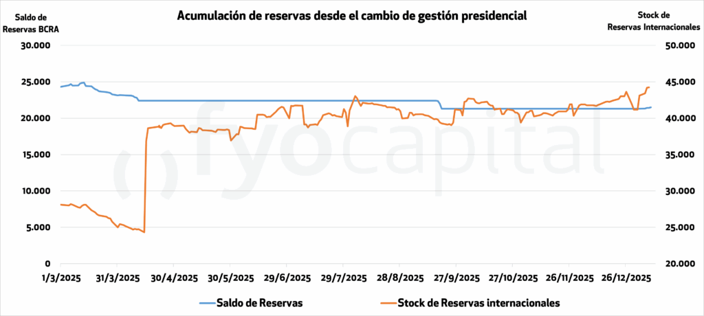 En tercer lugar, esta estrategia de acumulación de reservas no se realiza en el vacío, sino que se trata de un trabajo en conjunto entre Tesoro y BC en el cual el Banco Central compra y el Tesoro vende. Sin ir más lejos, el primer día de compras del BCRA (21 millones) el Tesoro vendió 13 millones por mercado y el 2 de enero, previo al inicio de las compras, vendió 266 millones para sostener el tipo de cambio. Es esta dinámica de compra por un organismo del Estado y venta por otro es lo que le sigue poniendo un piso al riesgo país en la zona 550-570 puntos, ya que desde el mínimo de la era de Milei en 553 el 02/01/2026 el riesgo país se mantuvo en este rango. La continuación de la reducción del riesgo país queda ahora atada al resultado del saldo de la acumulación de reservas, es decir de la acumulación de reservas netas entre las compras del BCRA y las ventas del Tesoro. Mientras más positivo resulte este saldo mes a mes, más cercano estará nuestro target de retorno al mercado como emisores de bonos internacionales de 425 pts.