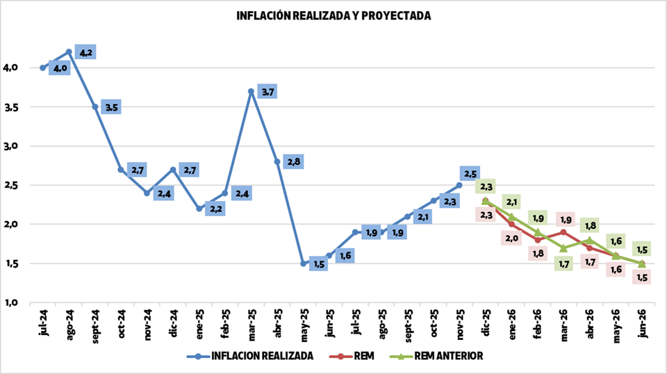 La semana pasada el Banco Central publicó el REM correspondiente al mes de diciembre 2025. El mismo arrojó una inflación estimada para diciembre de 2,3%, ajustando este dato al alza en 0,2pp respecto de la publicación anterior. Mas allá de este ajuste al alza, de materializarse la estimación del 2,5%, se repetiría la inflación del mes previo, frenando con una seguidilla de 4 meses consecutivos de aumento. La inflación estimada para los próximos 12 meses también registró un ajuste a la baja, del 0,9% llegando a 20,1%.