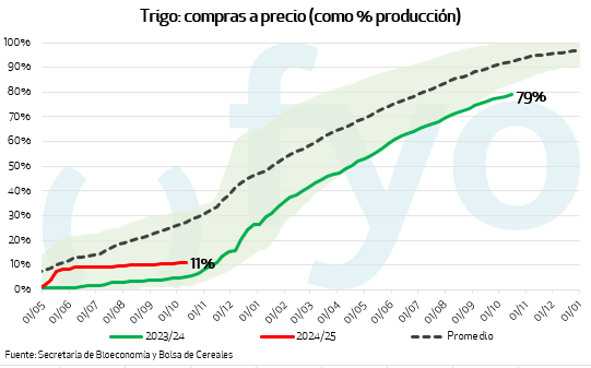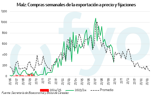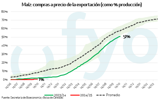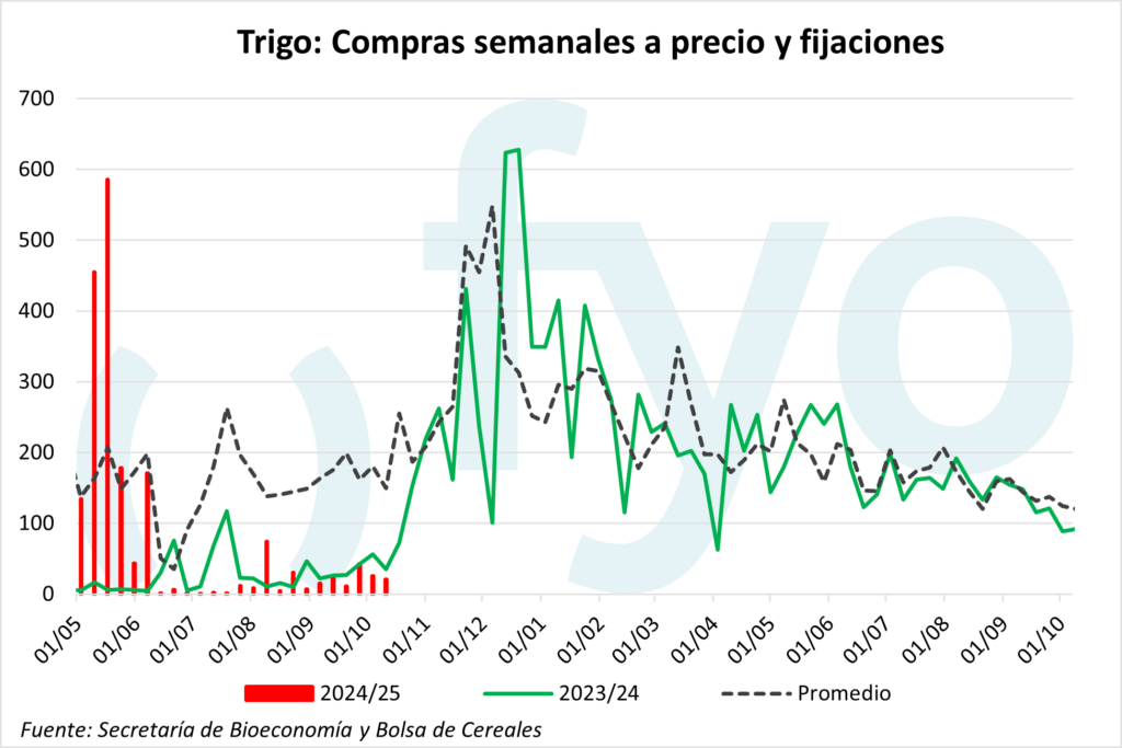 Para la semana finalizada el 9 de octubre, el pricing de soja 2023/24 creció de 305.000 a 420.000, acumulando un 48% del total de la producción. El maíz disponible perdió ritmo de pricing, aunque en línea con los promedios; mientras la originación de la cosecha nueva disminuyó nuevamente, esta vez desde las 140.000 toneladas a 48.600 t. Sobre el trigo, no se vieron sorpresas en el volumen comercializado tanto para la cosecha vieja como la nueva, con acumulados por debajo de los promedios.