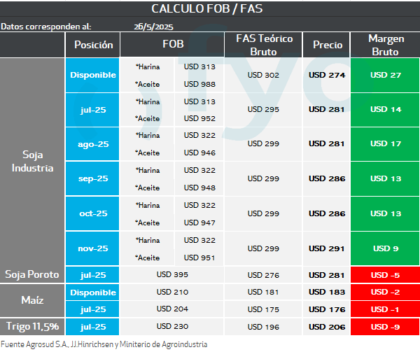 En el caso de la posición fábrica se parte de los precios FOB de los subproductos, luego se les aplica al valor del aceite, el porcentaje de rendimiento del poroto de soja para la extracción del mismo, y lo mismo en harina. Se suman estos valores, y se descuenta el costo de molienda estimado. El resultante es la capacidad teórica de la fábrica.