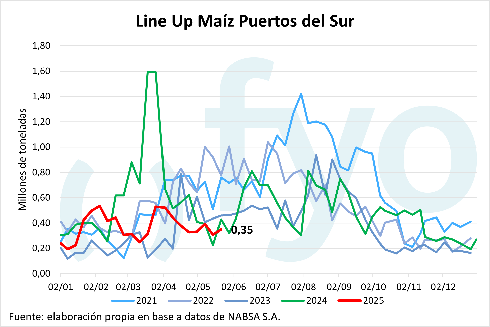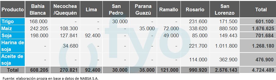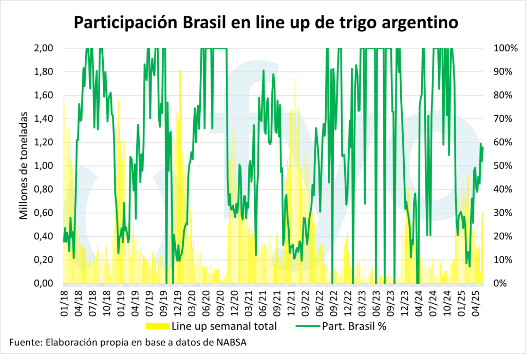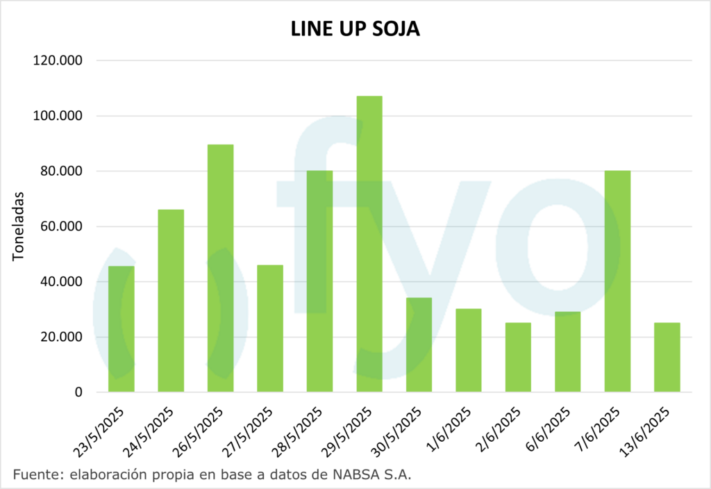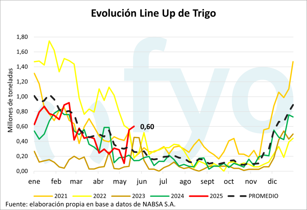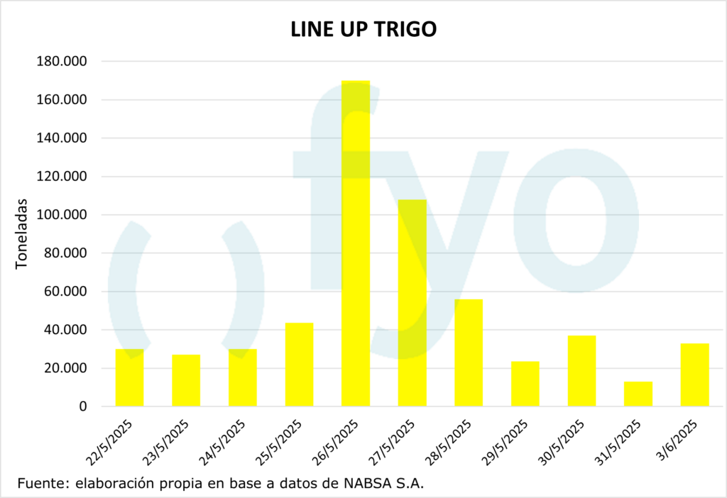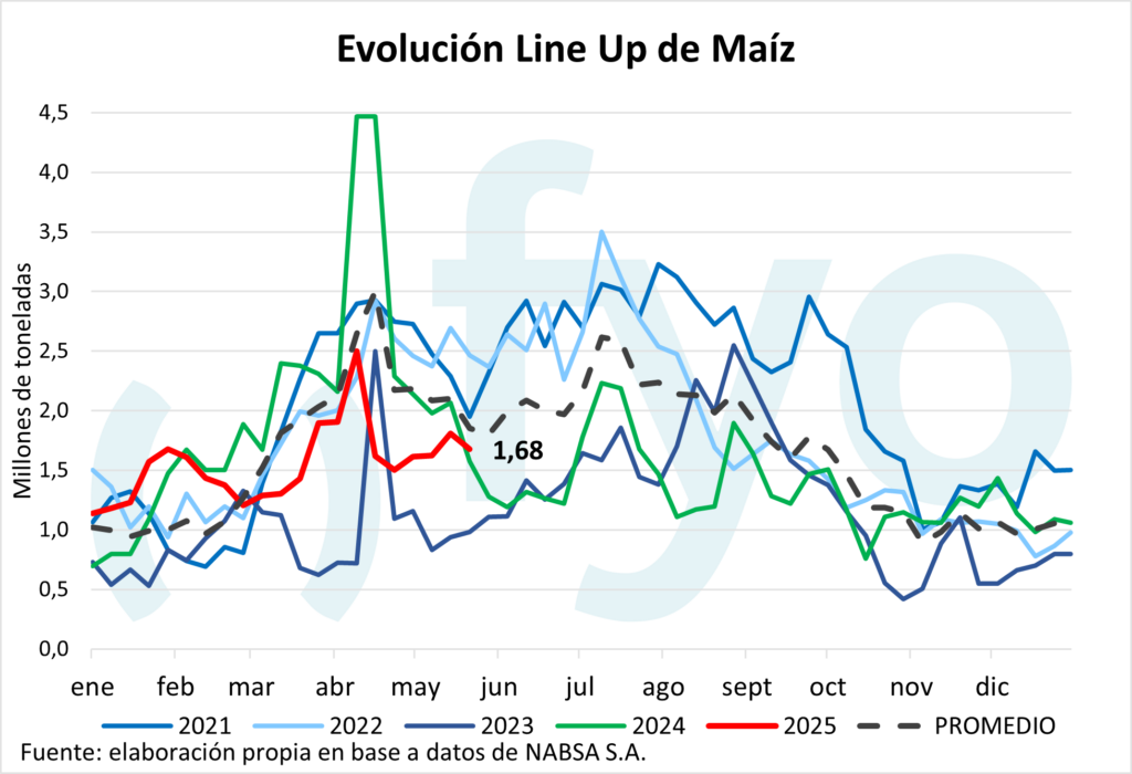 El line-up de maíz vuelve a ceder, con un volumen de 1,68 Mt, por debajo del promedio de 1,9 Mt para esta época del año.