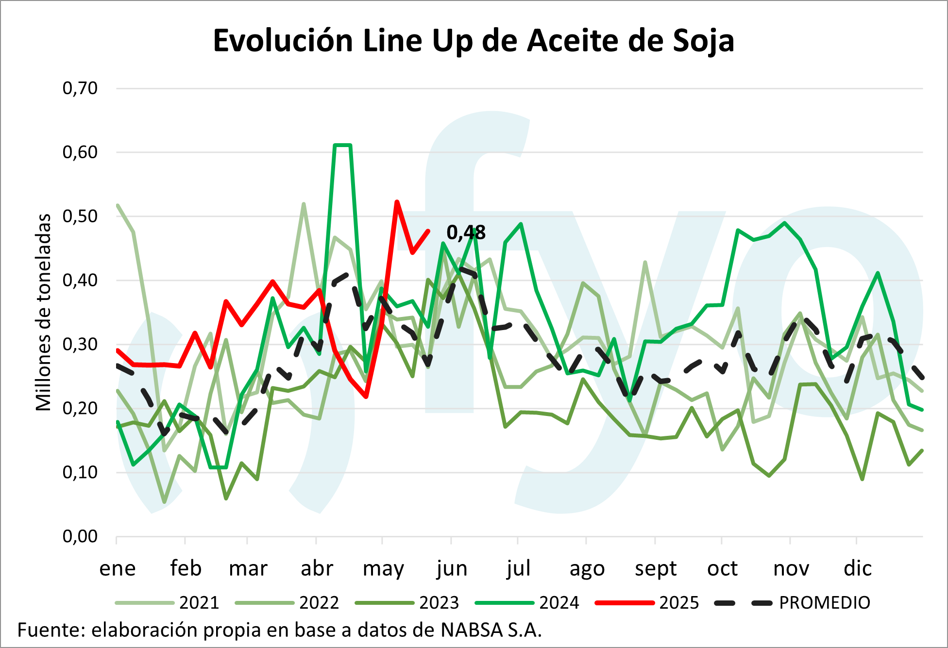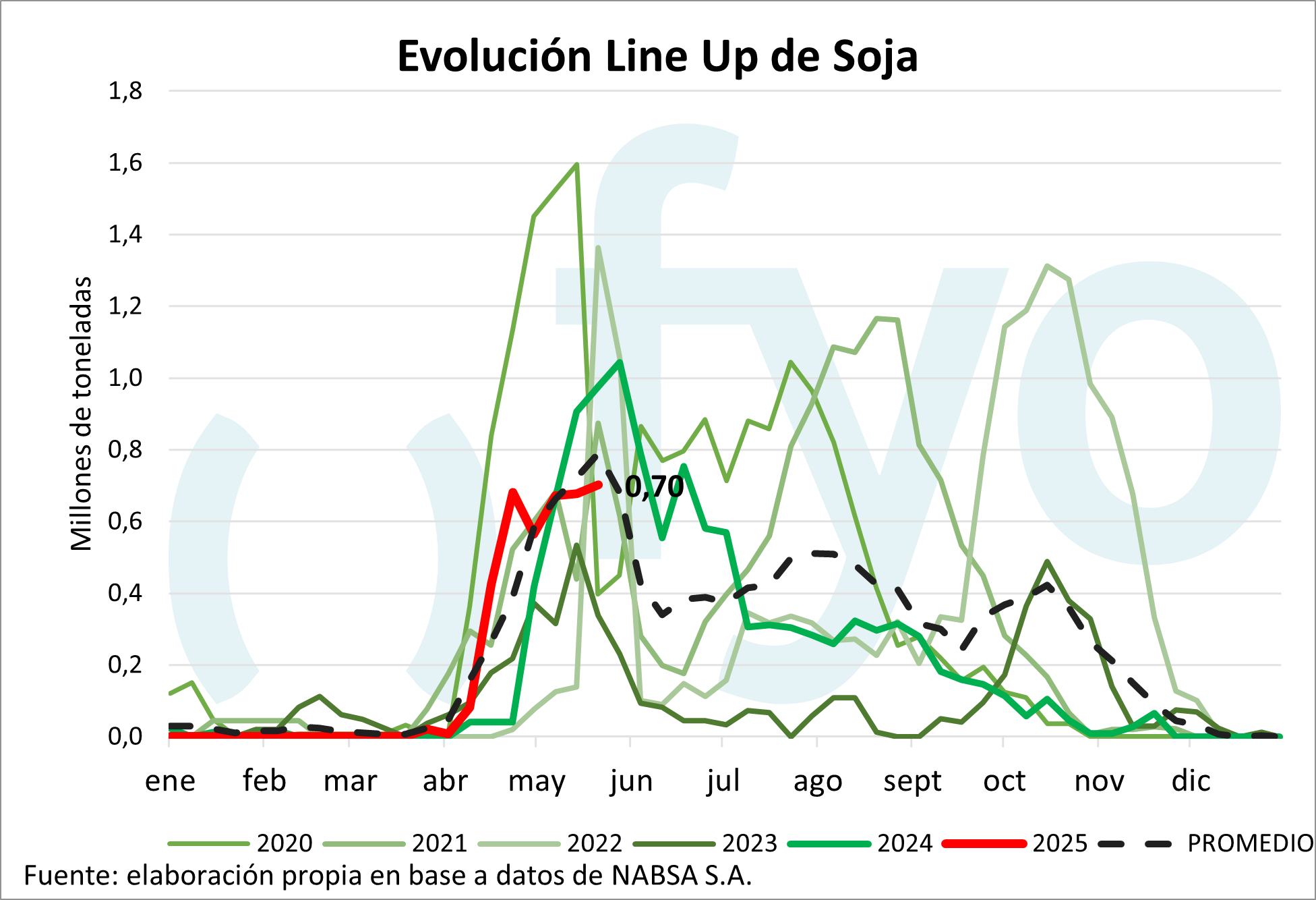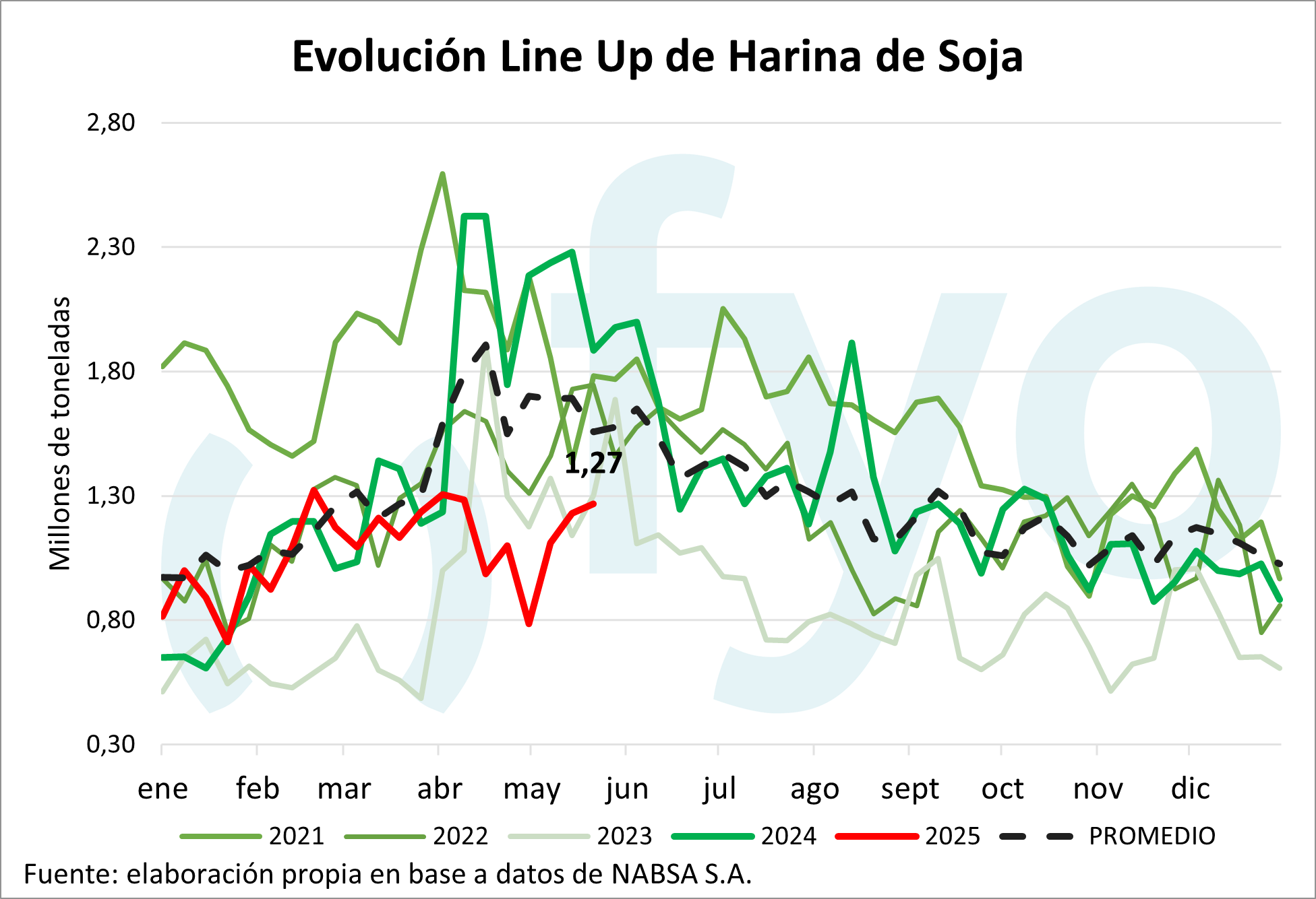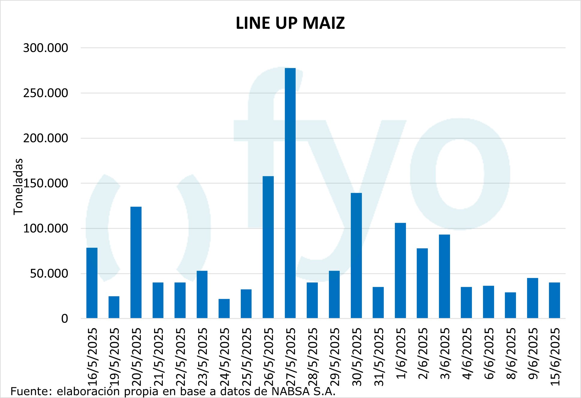 El line-up de maíz vuelve a ceder, con un volumen de 1,68 Mt, por debajo del promedio de 1,9 Mt para esta época del año.