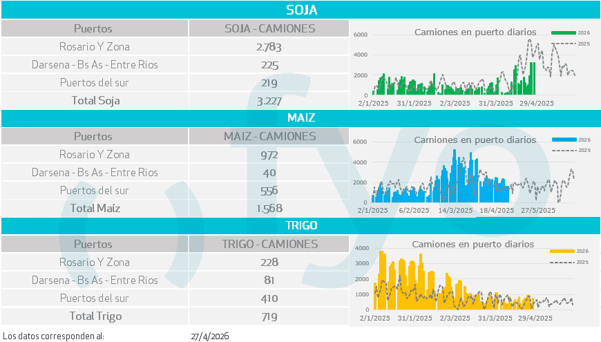 - Tras el cese de las lluvias, el fin de semana se registraron en promedio 3000 camiones cargados con soja a primera hora de día en puertos argentinos señal de la reactivación de las labores de cosecha.