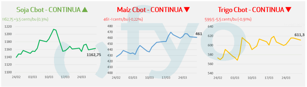 - Cotiza en torno a la neutralidad en una rueda marcada por la cautela ante el encarecimiento de los costos de producción y la espera de datos oficiales de siembra en EE.UU. que USDA dará a conocer mañana en el informe de Prospective Plantings.