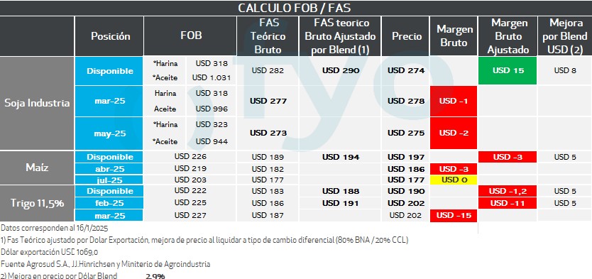 En el caso de la posición fábrica se parte de los precios FOB de los subproductos, luego se les aplica al valor del aceite, el porcentaje de rendimiento del poroto de soja para la extracción del mismo, y lo mismo en harina. Se suman estos valores, y se descuenta el costo de molienda estimado. El resultante es la capacidad teórica de la fábrica.