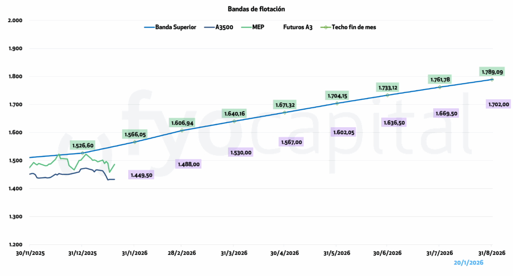 Tras haber marcado su pico post elecciones en $1475 el 02/01/2026, el tipo de cambio mayorista lleva 10 ruedas a la baja, habiendo terminado el viernes pasado en $1430, lo que implica una caída de $45 o 4,05% en dos semanas de operatoria, situándose a 7,7% de la banda. En el mientras tanto, el BCRA compró 708 millones de dólares por mercado.