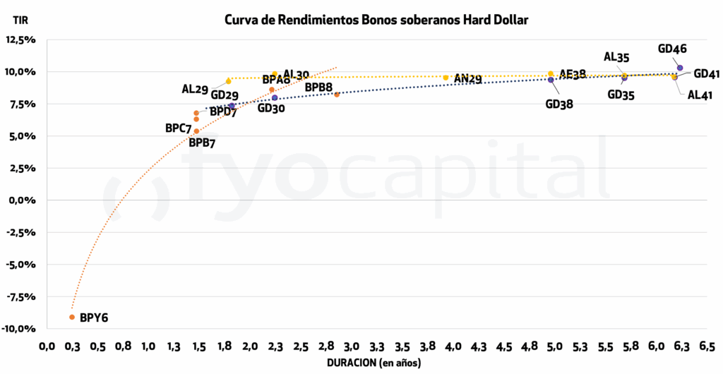 En lo que hace al posicionamiento en renta fija hard dólar, tenemos diferentes valoraciones acerca de qué instrumentos seleccionar según a qué duration apuntemos. En lo que hace al tramo corto, para aquellos que posean bonos globales (el universo de los GD) vemos con buenos ojos el rotar hacia obligaciones negociables hard dollar, dado que se ha dado una compresión de la tasa de los globales que los deja con rendimientos apenas superiores a ON de la misma duration (7,4% el GD29 y 7,9% el GD30).
