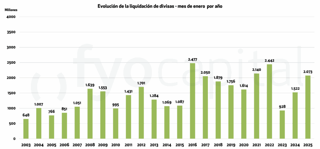 De esta manera, la liquidación del agro volvería a estar en torno a los 1.600 millones de dólares durante enero, una recuperación significativa desde los 759 millones de noviembre y los 1.014 de diciembre. Esto implicaría un crecimiento intermensual en la oferta de dólares de este sector de casi un 60%, aun cuando todavía los precios FOB sigan relativamente bajos.
