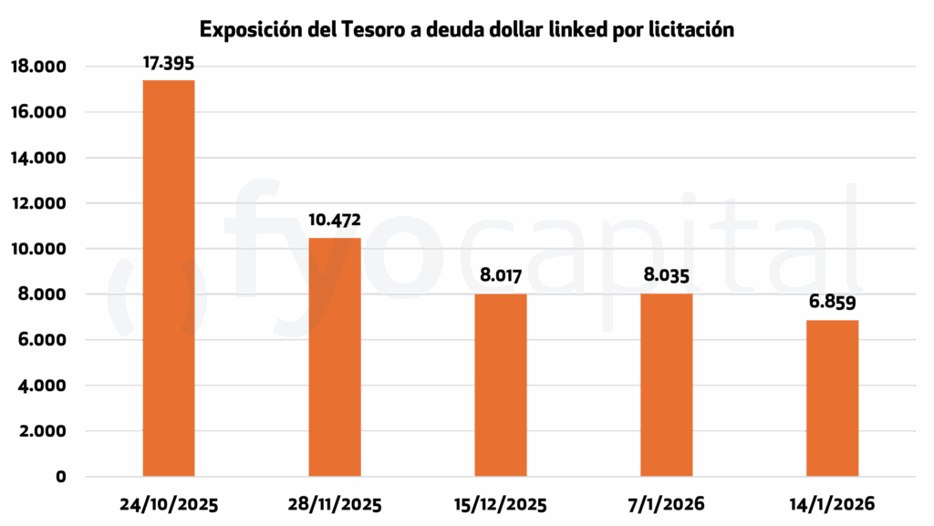 Esto no cambia que el mercado haya reducido su demanda de cobertura cambiaria, ya que el 16/01 vencieron 1.304 millones del bono dollar linked D16E6, y la demanda por D27F6 fue de sólo 128 millones, lo que nos arroja un saldo neto de -1.176 millones de dólares menos de exposición del Tesoro al tipo de cambio.