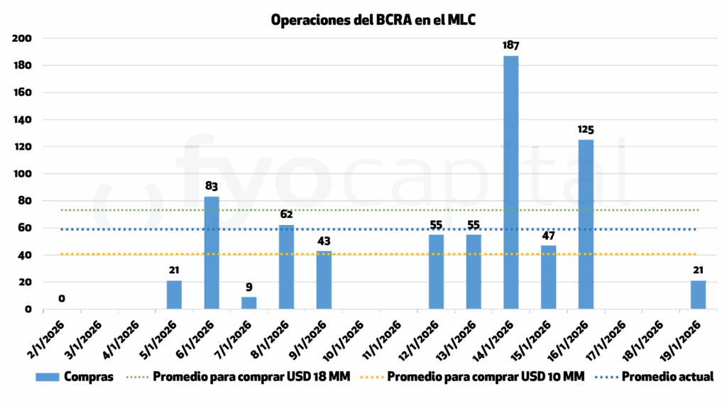 Al 19 de enero el Banco Central lleva 11 ruedas seguidas de compras, acumulando USD 708 M, un 7,1% del objetivo anunciado de USD 10.000 M para fin de año. Para llegar a este objetivo mínimo se necesitaría un promedio de compras diarias de USD 40,7 M y hoy el ritmo promedio de acumulación es de USD 62,5M diarios. De lograr mantenerse este ritmo para fin de año se acumularía un total de USD 15.300 M, cercano a los USD 18.000 M que Caputo planteó como objetivo posible ante un aumento acelerado de la recuperación de la demanda de pesos.