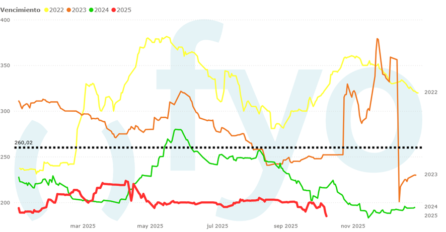 El viernes, los precios alcanzaron los USD 185, mínimos para la época de varios años, mientras que la posición diciembre cerró hoy levemente por debajo de ese nivel.