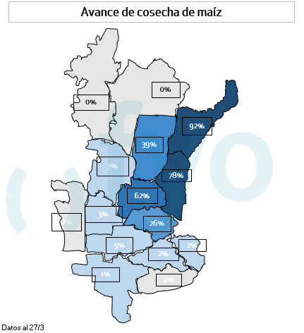 - Los cuadros de maíz tardío transitan mayoritariamente la etapa de llenado de grano, favorecidos por las lluvias recientes que sostienen su potencial productivo.