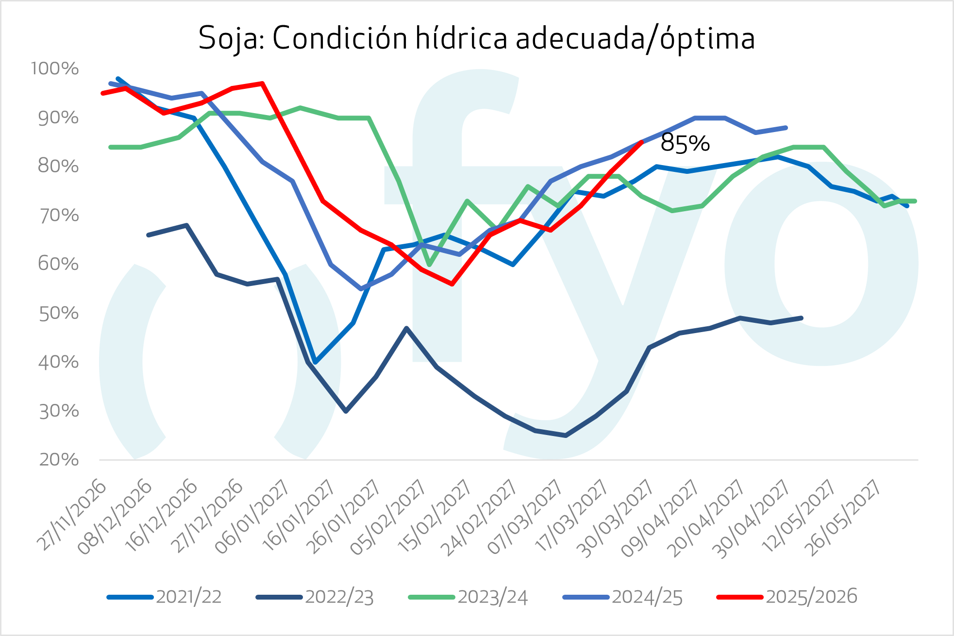 - El 85 % de la oleaginosa a nivel nacional presenta una condición hídrica Óptima/Adecuada, lo que representa un incremento de 7 pp. respecto a la semana previa.