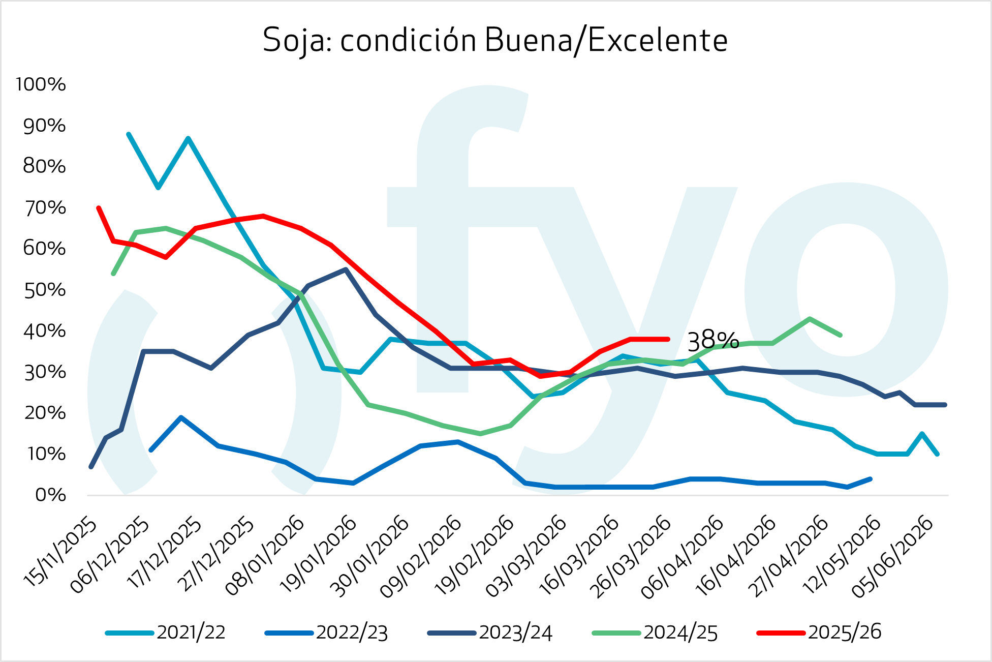 - La soja de segunda presenta el 76 % del área entre formación de vainas y llenado de grano, beneficiada por las últimas lluvias que elevaron su condición positiva en 7 pp..