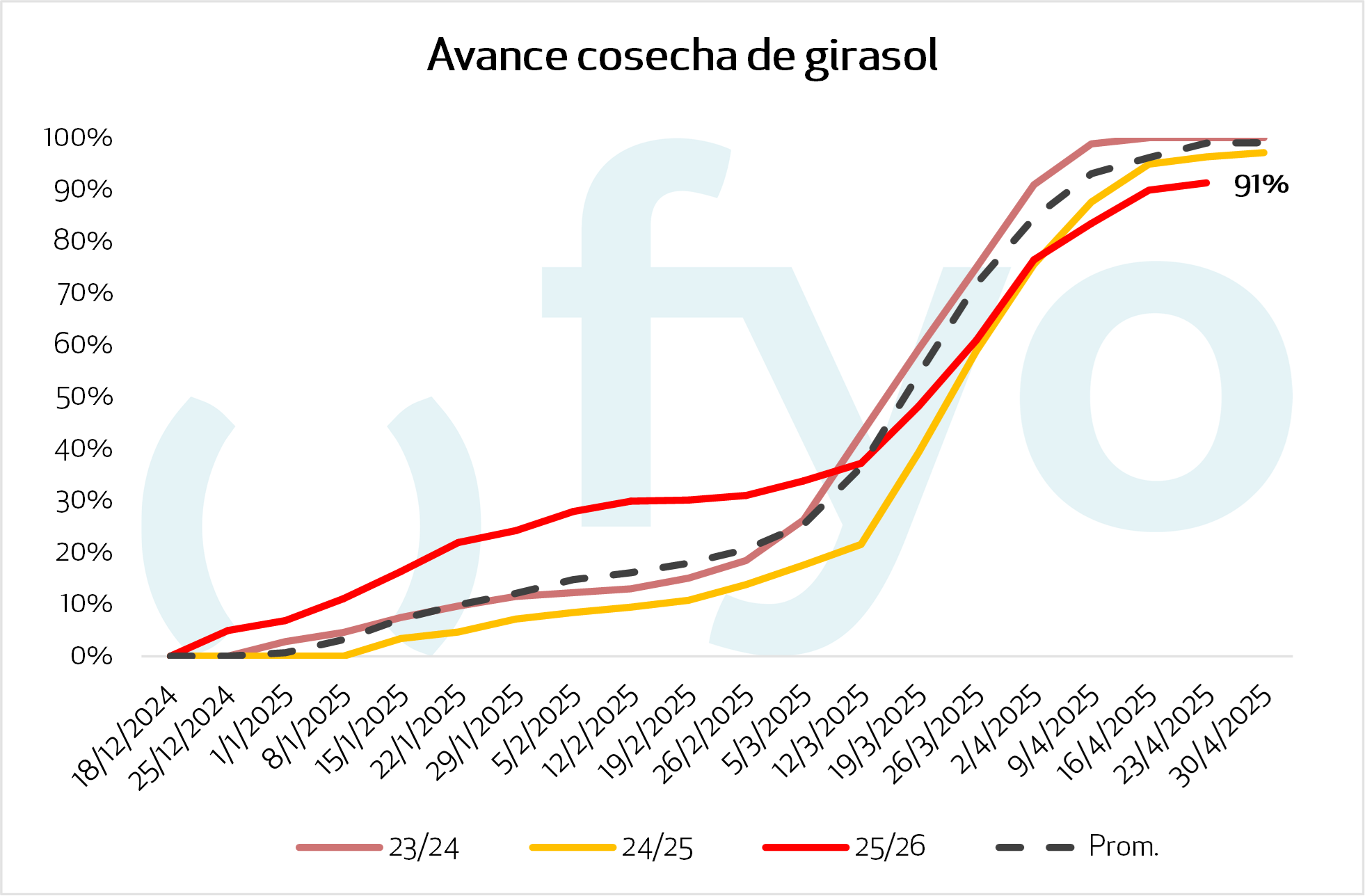 - La cosecha alcanza el 91,3 % del área apta, con un progreso intersemanal de solo 1,4 pp., manifestando una demora de -6,3 pp. respecto al promedio de las últimas cinco campañas.