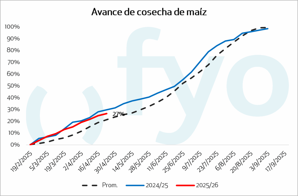 - En la región núcleo los rindes se ubican entre 95 qq/Ha y 100 qq/Ha, con el 30 % del maíz tardío ya en madurez fisiológica.