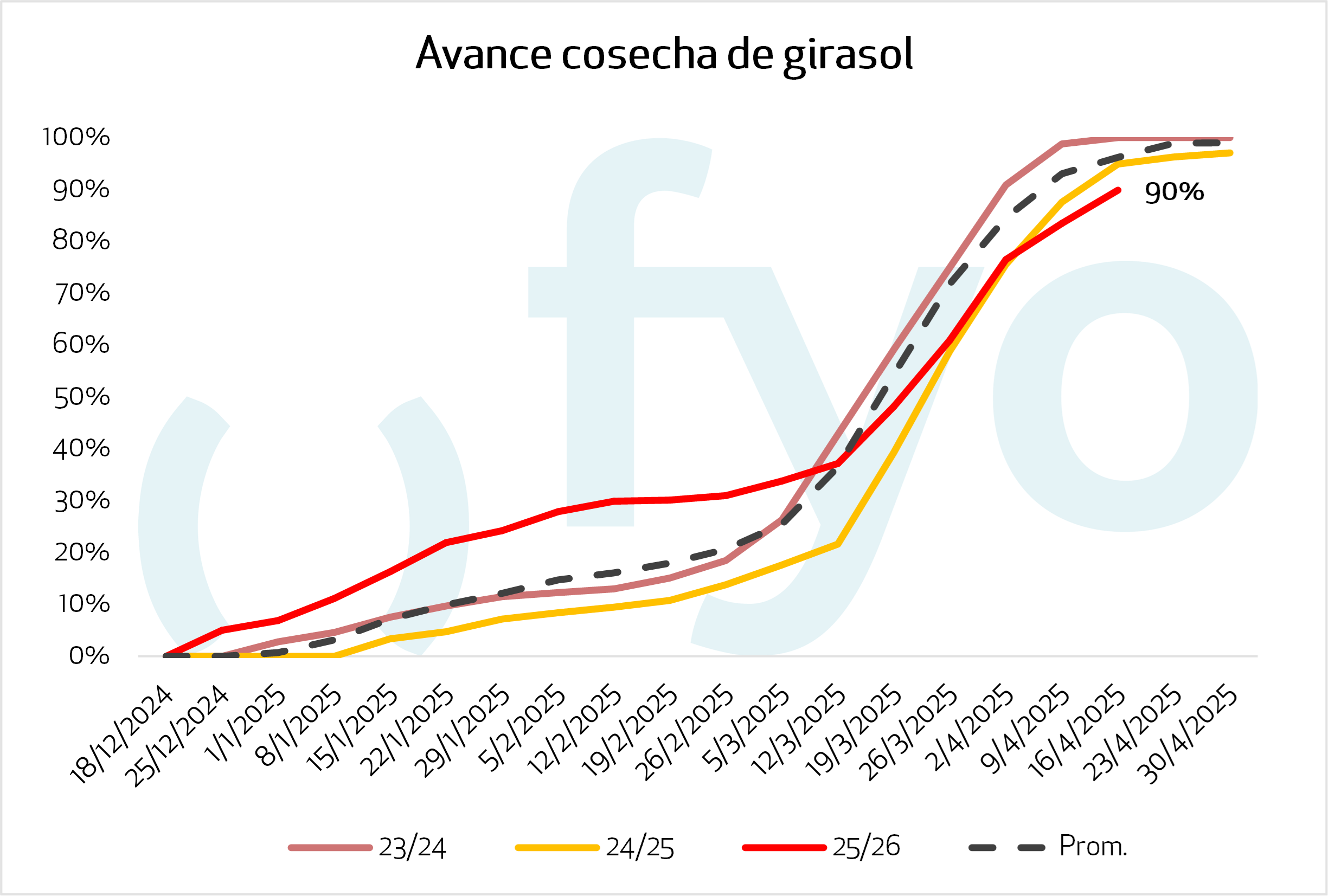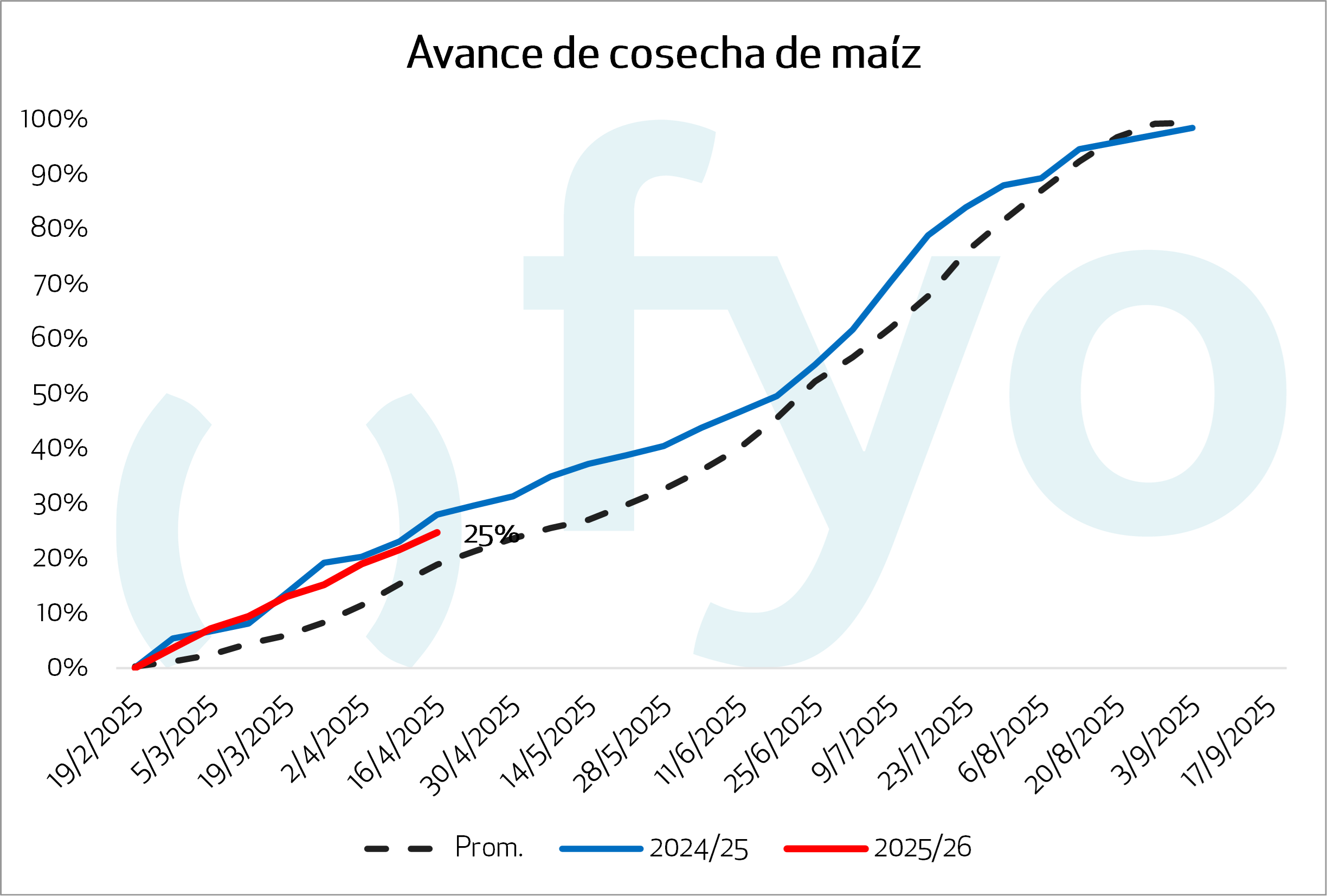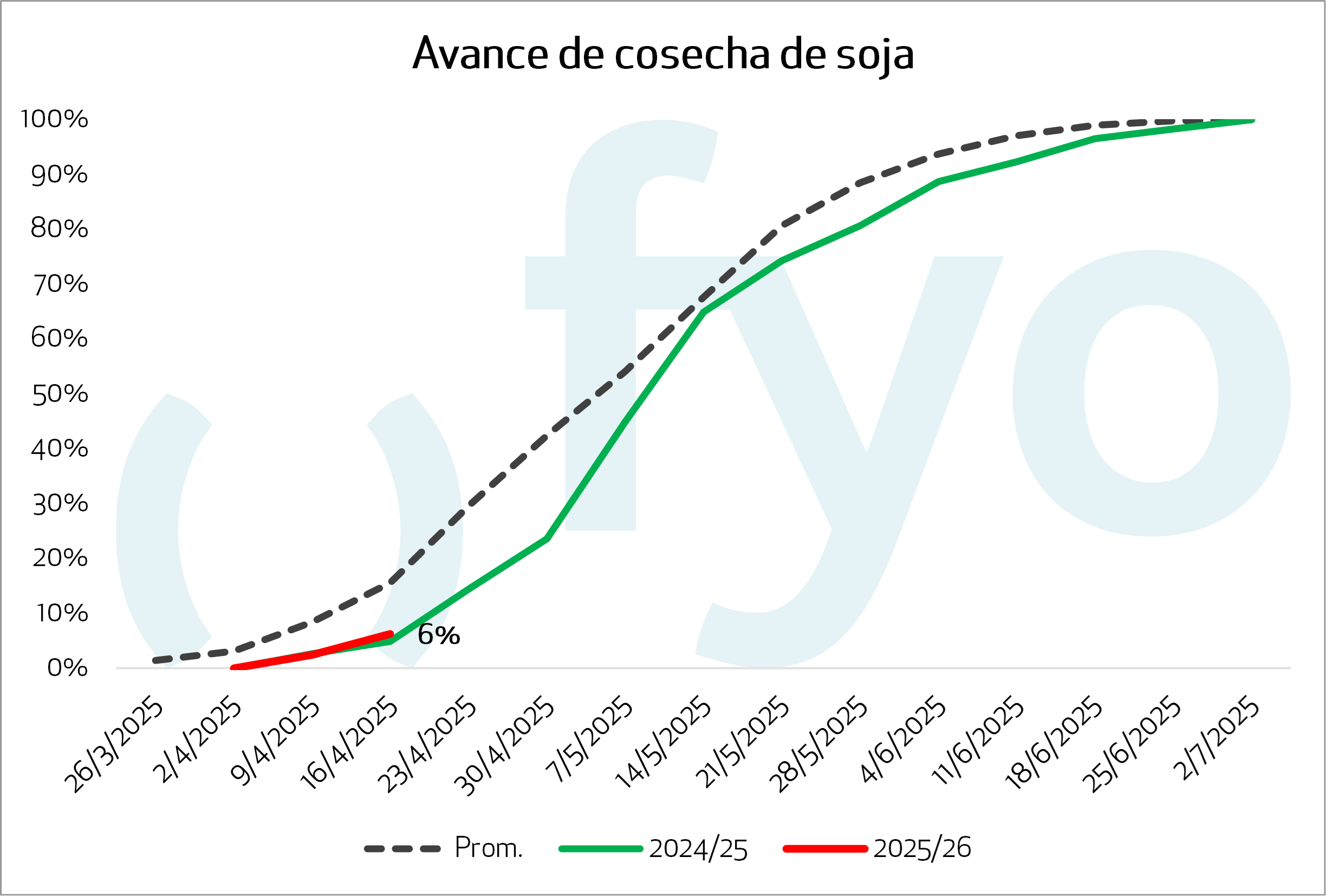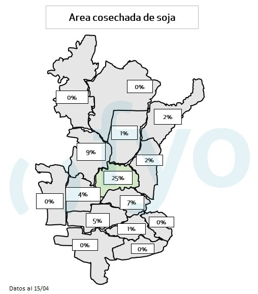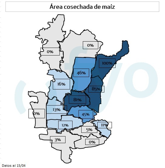 - El avance nacional de cosecha alcanza el 6,2 % del área apta, con un progreso intersemanal de 4 pp.. Presentan una demora de 2 pp. respecto al promedio de las últimas cinco campañas debido a lluvias recientes.