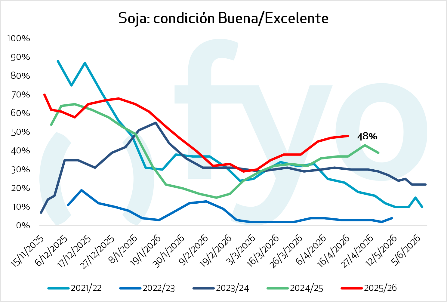 - El 48 % del cultivo se encuentra en condición Excelente/Buena.