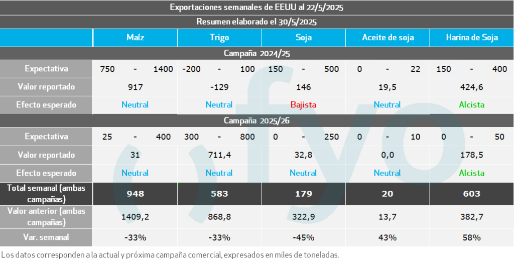 El USDA informó sus ventas externas para la semana finalizada el 22 de mayo.