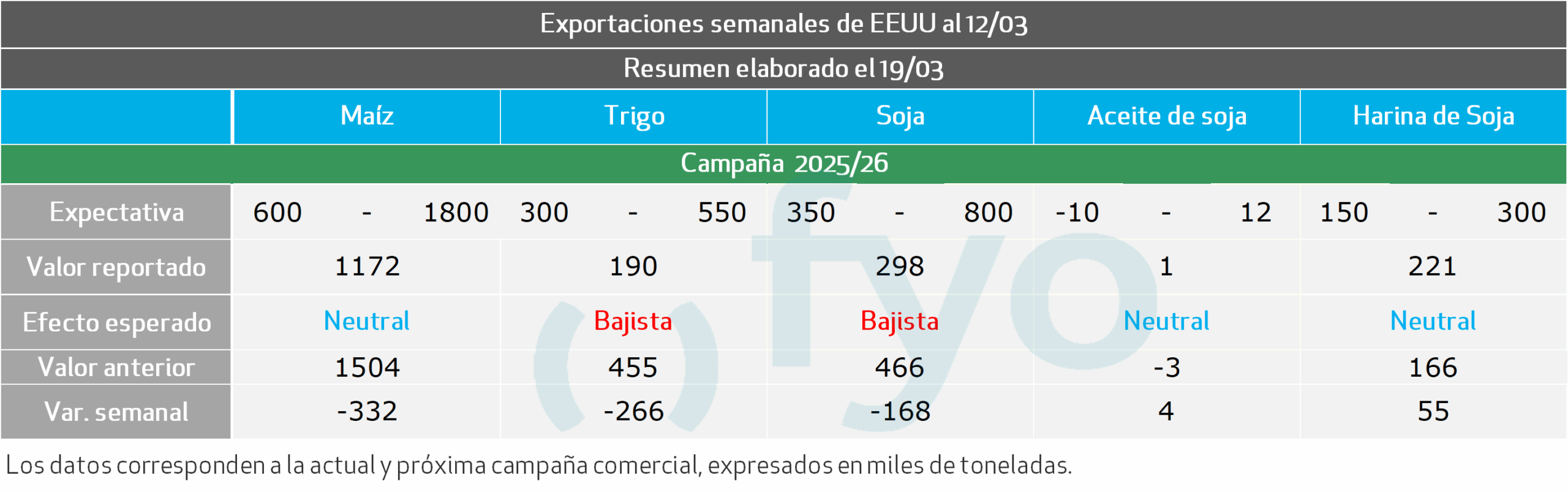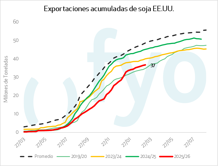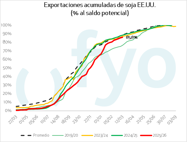 La soja reportó ventas netas 2025/2026 de 298.200 toneladas, una baja del 35% semanal y del 42% contra el promedio. El ciclo 2026/2027 sumó 6.600 toneladas. Las exportaciones del grano alcanzaron 906.500 toneladas, con un descenso del 9% semanal y del 14% frente al promedio. La harina de soja registró ventas de 220.900 toneladas, mientras que el aceite de soja reportó embarques por 11.600 toneladas.