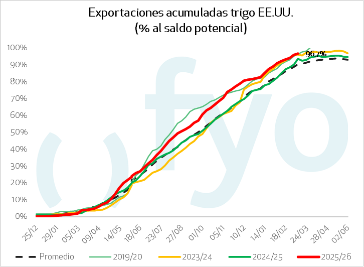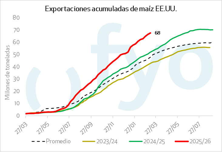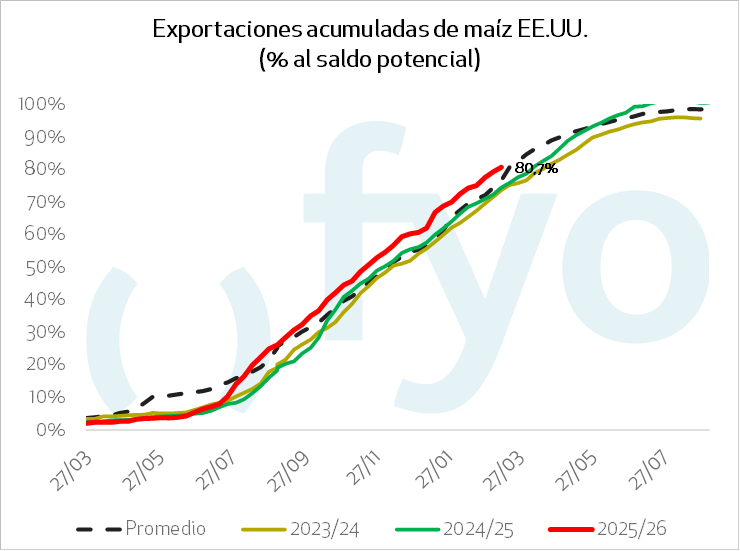 En maíz, las ventas netas 2025/2026 fueron de 1.171.800 toneladas, cayendo un 22% semanal y un 18% respecto al promedio previo. Los embarques sumaron 1.749.800 toneladas, un alza del 4% semanal y sin cambios frente al promedio de las últimas cuatro semanas. México y Japón destacaron como los principales destinos de los cargamentos.
