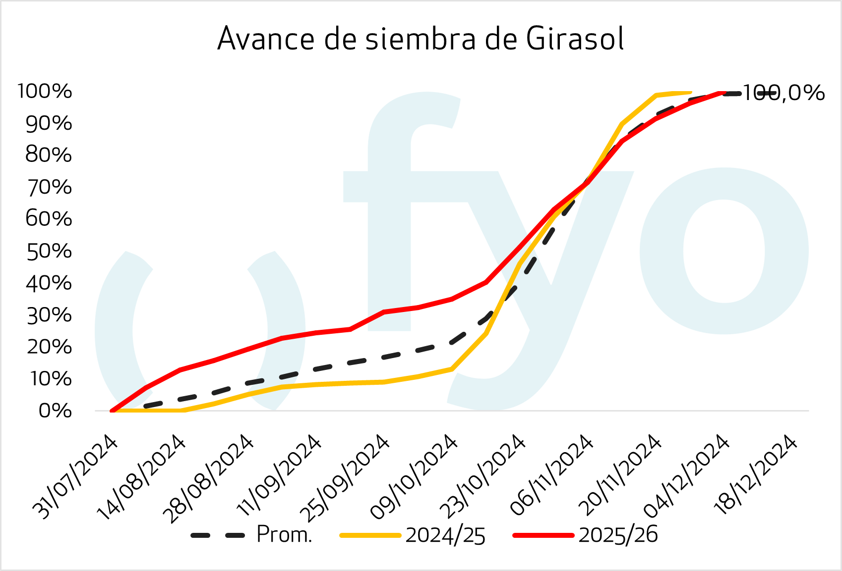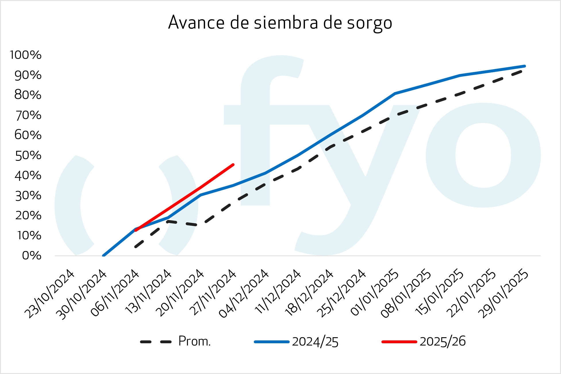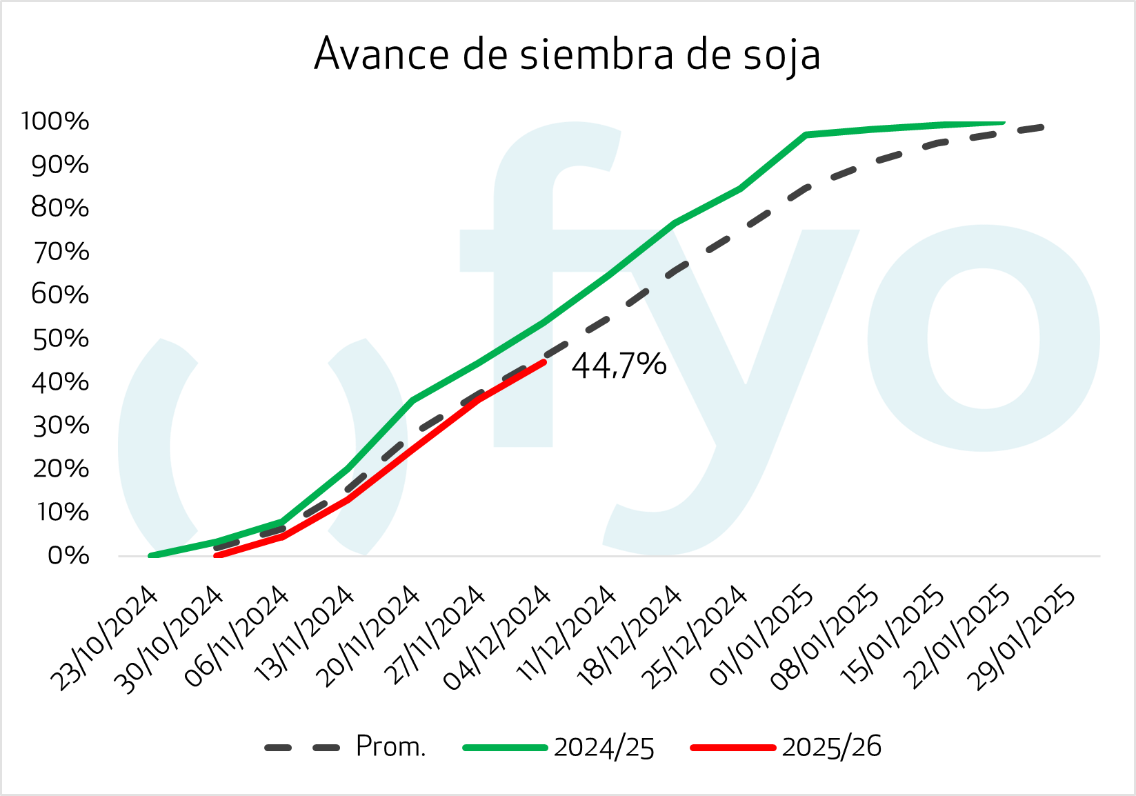 - La siembra avanzó al 45,4 % de las 900.000 Ha proyectadas, con un progreso quincenal de 11,4 pp. y un adelanto interanual de 4,3 pp..