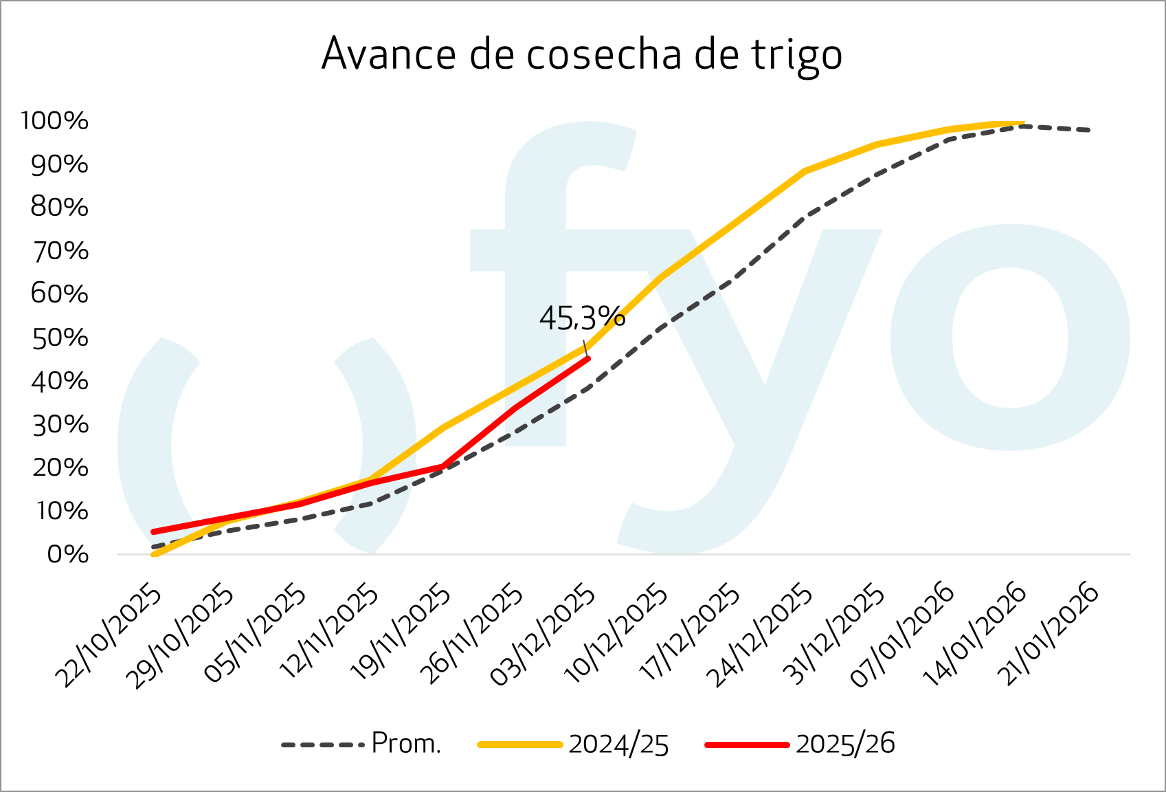 - La cosecha cubre el 45,3 % del área apta, con un progreso intersemanal de 11,4 pp., manteniendo rindes elevados que promedian 39,2 qq/Ha a nivel nacional.