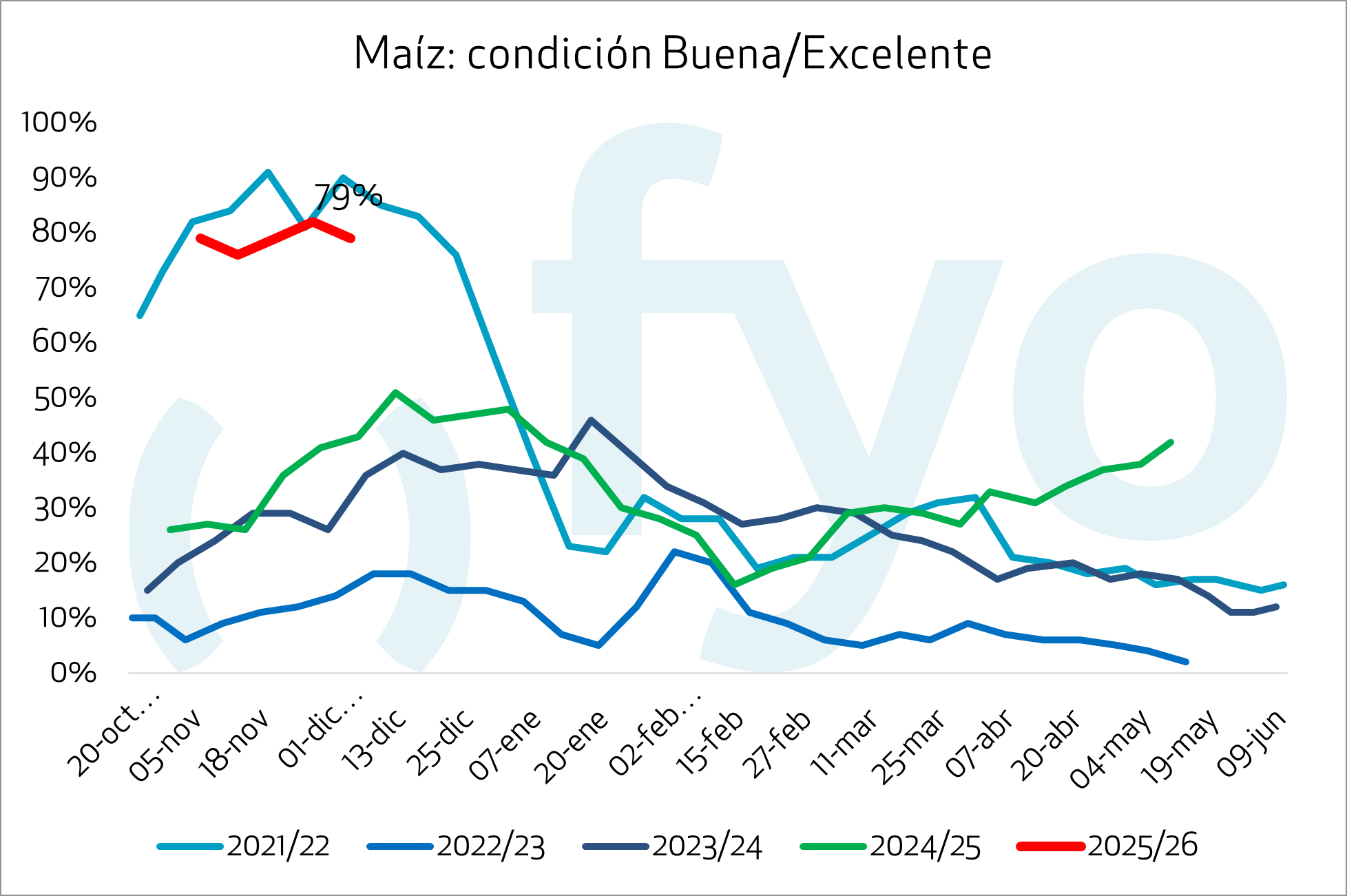 - El 79 % del cultivo mantiene una condición Excelente/Buena.