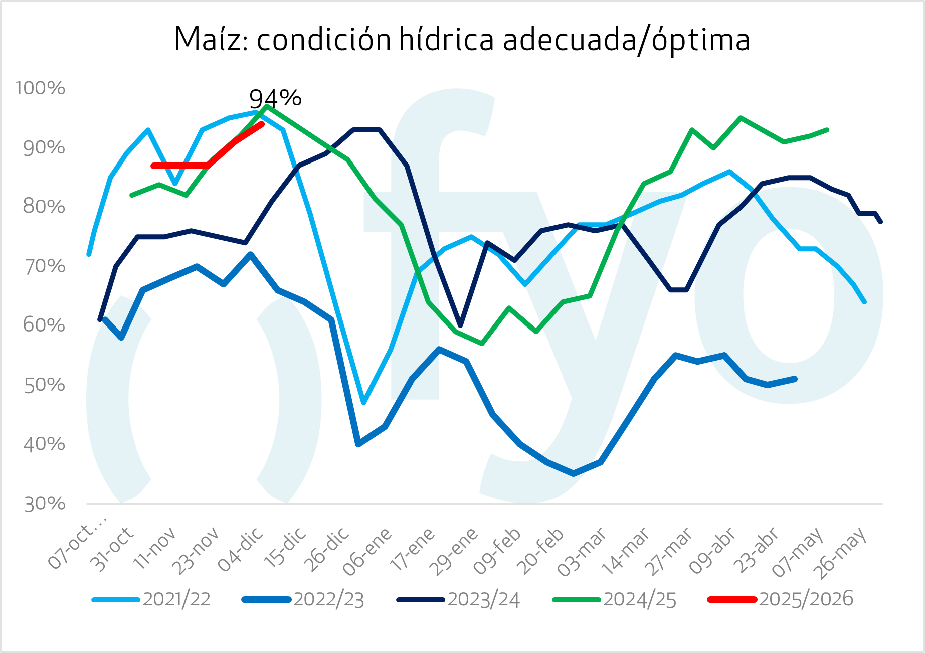 - El 96 % del área presenta una condición hídrica Óptima/Adecuada, una mejora de 1 pp. respecto a la semana previa.