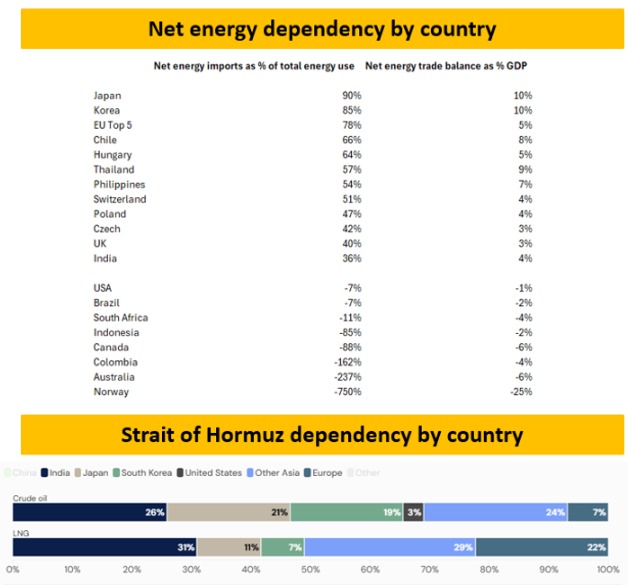 Existe una gran diferencia entre un impacto de los términos de intercambio del «Estrecho de Ormuz» y un impacto general de los términos de intercambio: Europa importa la mayor parte de su GNL de EE.UU. actualmente, lo que ayuda a explicar la débil pérdida del euro frente al dólar. De la misma manera, Japón importa alrededor de un 21% de su petroleo desde el Golfo, lo que permite explicar el movimiento del 2% del dólar contra el yen.